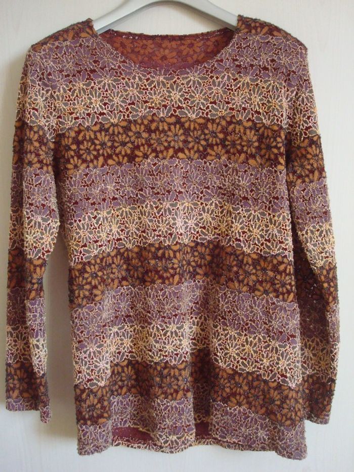 Haut à manches longues en trés bon état Joli tissu brodé de fleurs en relief dans les dégradés en harmonie de rose, marron, framboise, bordeaux.
