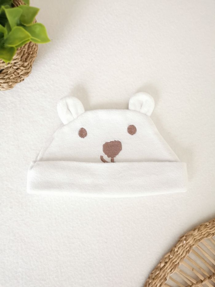 👶 Bonnet blanc velours 👶 La Halle 🖊️ ÉTAT ✅️: Très bon 🖊️ DESCRIPTION 🙂: ▪️Taille 1 Mois ▪️Matière: 80% coton - 20% polyester ▪️Tissu velours tout doux ▪️Base à revers cousu 🪡 ▪️Oreilles en 3D 🐻 ▪️Couleur: Blanc ⚪️ 💜