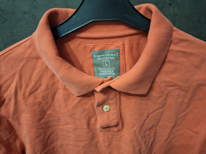 Polo manches courtes orange/abricot, col 2 boutons, petite broderie sur poitrine, fentes au bas sur les côtés, marque Angelo Litrico chez C&A, taille L, peu porté en très bon état