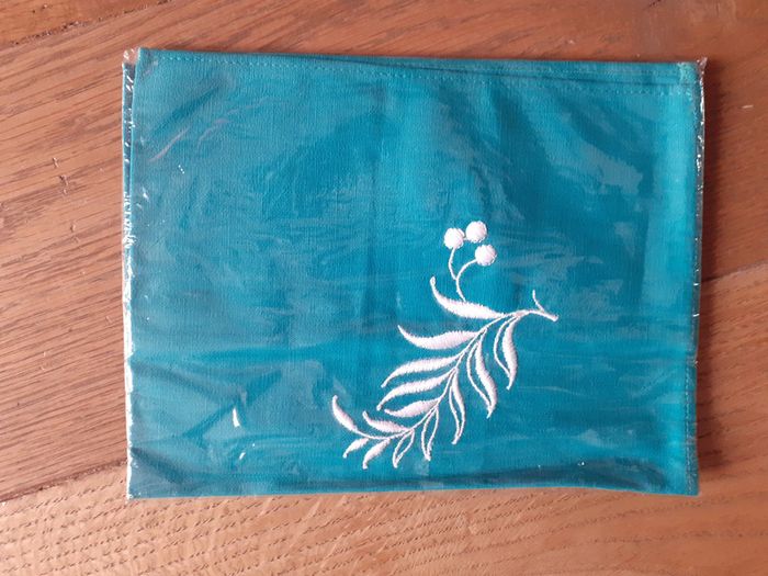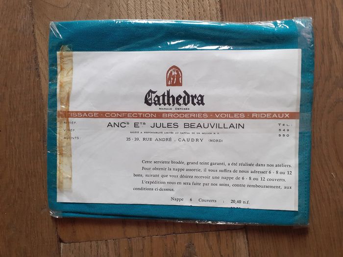 Serviette de table vintage sous blister avec une broderie rameau de feuille marque Cathedra Anciens établissements Jules Beauvillain Caudry Serviette brodée grand teint garanti Serviette livrée avec le bon de commande de l'époque en francs serviette carré 45 x 45 jamais servie 100% coton #vintage #serviettedetable #cathedra #caudry #beauvillain