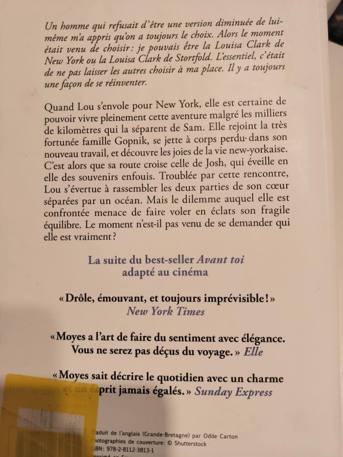 Quand Lou s'envole pour New York, elle est certaine de pouvoir vivre pleinement cette aventure malgré les milliers de kilomètres qui la séparent de Sam. Elle rejoint la très fortunée famille Gopnik, se jette à corps perdu dans son nouveau travail, et découvre les joies de la vie new yorkaise. C'est alors que sa route croise celle de Joshua, un homme qui éveille en elle des souvenirs enfouis. Troublée par cette rencontre, Lou s'évertue à rassembler les deux parties de son c¿ur séparées par un océan. Mais les lourds secrets qui pèsent sur elle menacent de faire voler en éclats son fragile équilibre. Le moment n'est-il pas venu de se demander qui elle est vraiment ? Biographie: Jojo Moyes vit en Angleterre, dans l'Essex. Après une carrière de dix ans dans le journalisme, elle décide de se consacrer à l'écriture. Ses romans, traduits dans le monde entier, ont été salués unanimement par la critique et lui ont déjà valu de nombreuses récompenses littéraires. Avant toi a créé l'événement et marqué un tournant dans sa carrière d'écrivain. Ce best-seller a rencontré un succès retentissant qui lui a valu d'être adapté au grand écran.