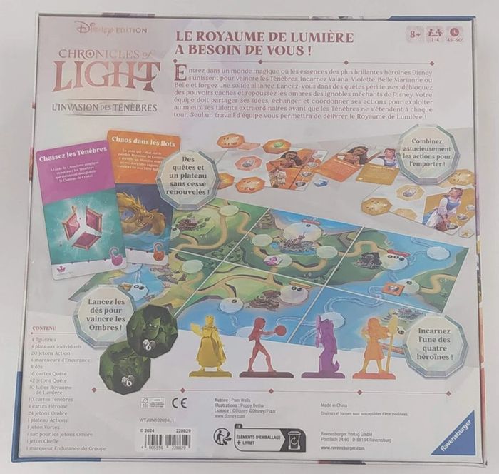 Ludipresta : Vente professionnelle - Jeu de société sous emballage - Prix Ferme Français à partir de 8 ans 30mn à 1h 1 à 4 joueur(s) Mécanisme(s) : Tuiles, Coopératif Incarnez une héroïne parmi Belle, Vaiana, Violette ou Marianne pour protéger le Royaume contre les ténèbres À chaque tour, coopérez pour accomplir vos quêtes tout en combattant les ténèbres, mais attention, les ténèbres s'abattent à chaque tour. Vous gagnerez ou perdrez ensemble face aux ténèbres. Choisissez astucieusement vos six actions à chaque tour pour parvenir à vaincre les ténèbres et fermer le vortex. Réalisez votre quête pour débloquer l'action spéciale de votre héroïne. Chronicles of Light offre une grande rejouabilité avec les différentes quêtes des héroïnes, quatre chacune, et les placements aléatoires des tuiles royaume. Le choix de vos quêtes et la forme de votre royaume rendra votre partie plus ou moins compliquée, à vous de moduler la difficulté souhaitée. Parviendrez-vous à vaincre les ténèbres et à sauver le royaume? vidéo : https://www.youtube.com/watch?v=vI7jYwu0nb8