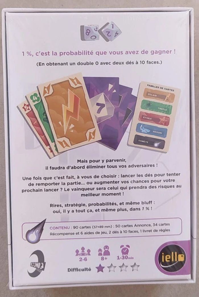 Ludipresta : Vente professionnelle - Jeu de société sous emballage - Prix Ferme Français à partir de 8 ans moins de 30mn 2 à 6 joueur(s) Mécanisme(s) : Bluff, Enchères, Cartes Un jeu qui fait décimal ! 1 % - Un Jeu qui fait Décimal, c'est la probabilité que vous avez de gagner ! (En obtenant un double 0 avec deux dés à 10 faces.) Mais pour y parvenir, Il faudra d'abord éliminer tous vos adversaires ! Une fois que c'est fait, à vous de choisir : lancer les dés pour tenter de remporter la partie... ou augmenter vos chances pour votre prochain lancer ? Le vainqueur sera celui qui prendra des risques au meilleur moment ! Rires, stratégie, probabilités, et même bluff : oui, il y a tout ça, et même plus, dans 1 % ! Vidéo : https://www.youtube.com/watch?v=GiRrYYbH-wM
