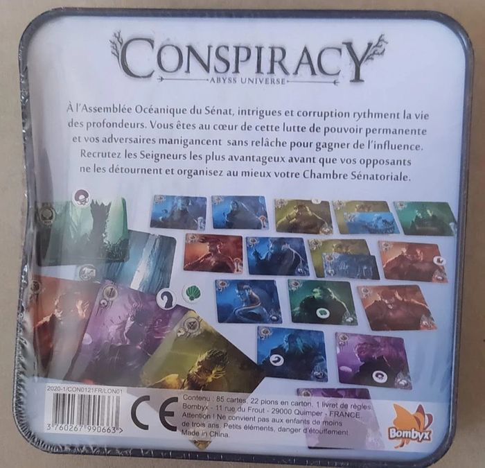 Vente professionnelle - Jeu de société sous emballage - Prix Ferme Français à partir de 8 ans 30mn à 1h 2 à 4 joueur(s) Intrigues et conspirations dans le Royaume d'Abyss Dans le royaume d’Abyss, intrigues et corruption rythment la vie des profondeurs. À l’Assemblée Océanique du Sénat, vous êtes au cœur de cette lutte de pouvoir permanente et vos adversaires manigancent sans relâche pour gagner de l’influence. Recrutez les Seigneurs les plus avantageux avant que vos opposants ne les détournent et organisez au mieux votre chambre sénatoriale. À l’Assemblée Océanique du Sénat, intrigues et corruption rythment la vie des profondeurs. Vous êtes au cœur de cette lutte de pouvoir permanente et vos adversaires manigancent sans relâche pour gagner de l’influence. Recrutez les Seigneurs les plus influents ! Recrutez les Seigneurs les plus avantageux avant que vos opposants ne les détournent et organisez au mieux votre Chambre Sénatoriale. Votre unique objectif est d’asseoir votre pouvoir et de régner en maître sur le royaume d’Abyss dans lequel se côtoient les cinq guildes de Seigneurs : les Politiciens, les Marchands, les Cultivateurs, les Militaires et les Sorciers.Parviendrez-vous à asseoir votre pouvoir et régner en maître sur l’Assemblée Océanique du Sénat ? Ralliez des Seigneurs à votre cause pour constituer la Chambre Sénatoriale la plus influente de l’hémicycle et vous assurer ainsi la mainmise sur l’Assemblée Océanique du Sénat. Conspiracy fait partie de l’univers d’Abyss mais se joue indépendamment des autres jeux. vidéo : https://www.youtube.com/watch?v=v5Zblg-BxTY Léger choc mais toujours sous scello Ludipresta