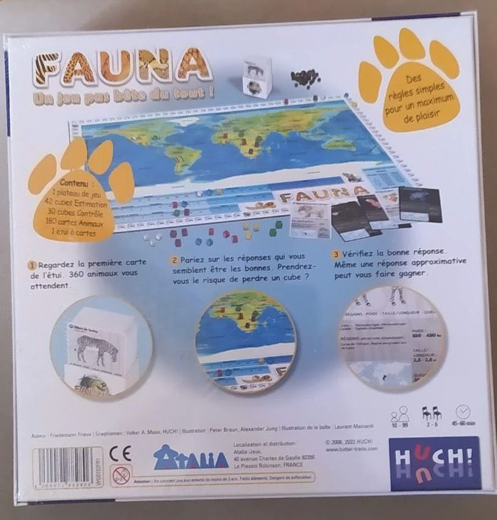 Vente professionnelle - Jeu de société sous emballage - Prix Ferme Français à partir de 10 ans 30mn à 1h 2 à 6 joueur(s) Mécanisme(s) : Paris, Bluff Fauna, un jeu pas bête du tout ! Saviez-vous qu'une girafe peut atteindre plus de 5 mètres de haut ? Que le Caïman Yacare ne pèse qu'environ 60 kg ? Et combien mesure la queue de l'ours polaire ? Voici le type de questions auxquelles il vous faudra répondre dans Fauna. Peur de ne pas tout savoir sur les 360 ​​animaux présents dans le jeu ? Pas d'inquiétude : même en restant approximatif, vous pouvez gagner des points. Par contre, pas sûr que vous remportiez la partie, si vous jouez chaque manche au bluff ! Déroulement du jeu : À chaque manche, les joueurs estiment les habitats et les mensurations d’un animal. Chacun leur tour, ils posent un de leur 6 pions Estimation sur une case inoccupée du plateau : une région du planisphère ou une case sur les échelles de mesure (poids, taille, longueur de queue) Lorsque tous les joueurs ont posé leurs pions ou passé, on passe au décompte : Les pions placés sur une case correcte rapportent le plus de points, Les pions placés sur une case adjacente à une case correcte rapportent un peu moins de points, Les autres pions (trop loin d'une bonne réponse) sont écartés. En fin de tour, chaque joueur peut récupérer un pion écarté. En fin de partie, le joueur qui cumule le plus de points gagne. Vidéo : https://www.youtube.com/watch?v=xeS-XnolUnE Ludipresta