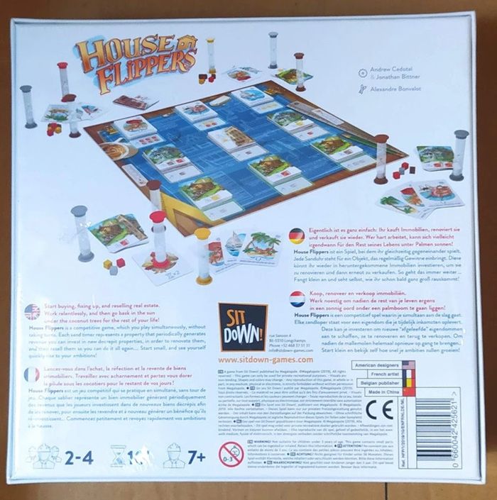 Vente professionnelle - Jeu de société sous emballage - Prix Ferme Joueurs : 2-4 Age : 7+ Temps : 30 min House Flippers, les as de la rénovation Vous êtes à la tête d'une entreprise qui achète des biens immobiliers à bas prix pour les rénover et les revendre rapidement au meilleur prix. House Flippers, un jeu de rapidité Dans House Flippers, tous les joueurs paient, simultanément, pour acquérir des cartes qu’ils peuvent revendre dans la foulée afin de générer un bénéfice. Chaque sablier, une fois épuisé, génère un revenu. Puis est à nouveau retourné. Le joueur ayant réalisé le plus de bénéfice, gagne la partie. Saurez-vous sauter sur les meilleures opportunités et accéder à l’une des trois conditions de victoire sans oublier de gérer vos sabliers ? Vidéo : https://www.youtube.com/watch?v=9UwATXuhw5E Ludipresta