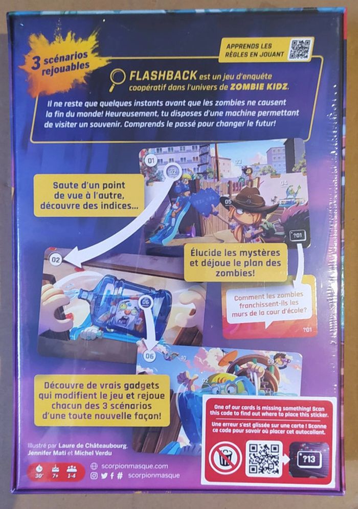 Vente professionnelle - Jeu de société sous emballage - Prix Ferme As d'or 2023 Français à partir de 7 ans moins de 30mn 1 à 4 joueur(s) Un jeu d'enquête dans l'univers de Zombie Kidz Flashback: Zombie Kidz est un jeu d’enquête par images. Partez à l’aventure et coopérez en famille ou entre enfants dans un voyage figé dans le temps. Petit à petit, découvrez l’histoire au travers des yeux des personnages. En accumulant tous les points de vue, découvrez des indices, élucidez des mystères, et répondez aux questions qui sont posées. Comprendre le passé vous permettra peut-être de changer le futur et de sauver le monde des mangeurs de cervelle ! Dans l’univers très populaire de Zombie Kidz 3 scénarios qui se suivent et se racontent en 1 grande histoire Premier jeu d’enquête évolutif : 3 bidules cachés dans la boite qui modifient ta façon de jouer Une rejouabilité surprenante : à l’aide des bidules, rejoue les 3 scenarios d’une manière complètement différente Un jeu pour tous, de magnifiques illustrations et très peu de texte Une immersion immédiate ; vous voyez par les yeux des personnages Vidéo : https://www.youtube.com/watch?v=vZSHYgbaniQ Ludipresta