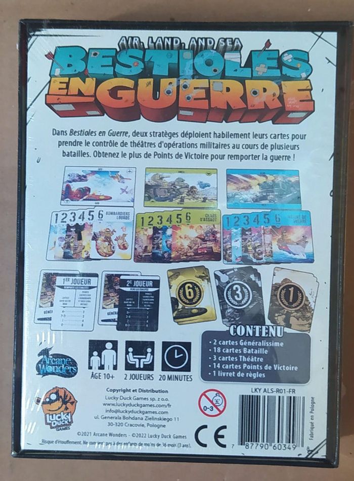 Jeu de société sous emballage - Prix Ferme Français à partir de 14 ans moins de 30mn 2 joueur(s) Une bataille épique pour 2 joueurs En tant que Commandant Suprême des forces militaires de votre pays, votre objectif est de gagner la guerre en étant victorieux dans une série de batailles ! Pour gagner une bataille, vous devez soit contrôler deux des trois théâtres de guerre après que les deux joueurs aient joué toutes leurs cartes de bataille, soit convaincre votre adversaire de se retirer ! Pour contrôler un Théâtre, la force totale de toutes les Cartes de Bataille de votre côté du Théâtre doit dépasser la force totale des Cartes de Bataille du côté de l'adversaire du Théâtre. Au début de chaque bataille, on vous distribue une main de six cartes. Vous ne tirerez pas de cartes supplémentaires pendant la bataille, vous devez donc formuler votre stratégie en vous basant uniquement sur ces cartes. Les joueurs jouent à tour de rôle des Cartes de Bataille, une par une, jusqu'à ce que toutes les cartes aient été jouées ou qu'un joueur décide de se retirer. L'ordre dans lequel vous jouez vos cartes de Bataille est crucial, tout comme la manière dont vous les jouez. Toutes les cartes peuvent être jouées face visible ou face cachée. Jouer une carte face visible déclenche sa capacité tactique, mais la carte doit être jouée dans le théâtre correspondant. Les cartes face cachée sont des cartes sauvages et peuvent être jouées dans n'importe quel théâtre, mais elles n'ont qu'une force de 2 et n'accordent pas de capacité tactique. vidéo : https://www.youtube.com/watch?v=6sCuBhSAN7I&ab_channel=Ludovox Ludipresta
