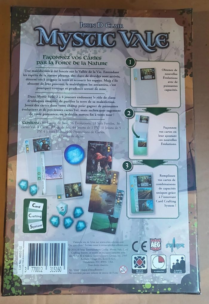 Jeu de société sous emballage - Prix Ferme Français à partir de 14 ans 30mn à 1h 2 à 4 joueur(s) Une malédiction a été placée sur la Vallée de la Vie. Ayant entendu les appels à l'aide des esprits de la nature, des clans de druides arrivent, déterminés à user de leurs bénédictions pour soigner la terre et sauver les esprits. Cela va requérir du courage et de la prudence, car la malédiction peut submerger les imprudents qui manient trop de puissance. Dans Mystic Vale, deux à quatre joueurs endossent le rôle de clans druidiques cherchant à lever la malédiction. Chaque tour, vous jouez des cartes sur votre terrain pour gagner de puissants avancements et d'utiles cartes de vallée. Utilisez votre pouvoir sagement, ou le déclin mettra fin à votre tour prématurément. Marquez le plus de points de victoire pour remporter la partie. Mystic Vale utilise un système innovant de "Card Crafting" qui vous laisse non seulement construire votre deck, mais aussi construire chaque carte individuellement, personnalisant les capacités de chaque carte pour déployer au mieux la stratégie qui est la vôtre. Vidéo : https://www.youtube.com/watch?v=OlZHEWHqKrE Ludipresta