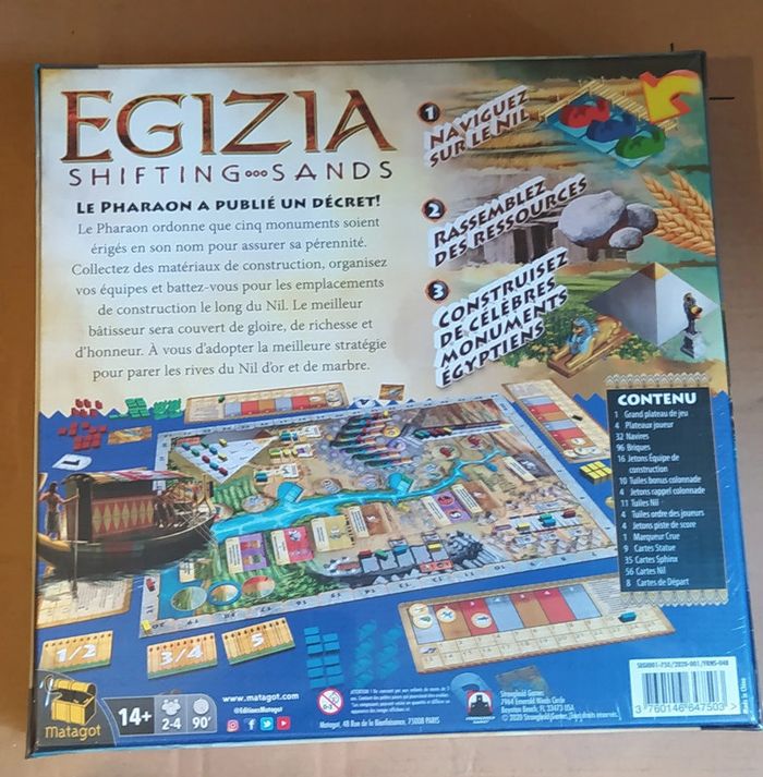 Jeu de société sous emballage - Prix Ferme 2 à 4 joueurs Environ 90 min. À partir de 14 ans Le Pharaon vient de publier un nouveau décret à destination de ses meilleurs bâtisseurs. Il vous ordonne d’édifier en son honneur non pas un, mais cinq glorieux monuments afin de lui assurer la reconnaissance éternelle. Le bâtisseur qui fournira le meilleur travail sera récompensé généreusement et tous ses rêves de richesse, de gloire et d’honneur deviendront réalité. Gérez vos ressources sans plus attendre, organisez vos équipes de construction et parez les rives du Nil d’or et de marbre. Egizia : Shifting Sands se joue en 5 manches. Au début d’une manche, les joueurs placent des Navires le long du Nil, dont les fluctuations sont représentées par des cartes et des tuiles qui varient à chaque manche. Les navires placés le long du fleuve permettent aux joueurs de récupérer les cartes Nil correspondantes afin de nourrir et renforcer leurs Équipes de construction, d’acquérir de nouvelles Carrières pour produire des pierres ou de nouveaux Champs pour récolter du blé, d’obtenir des cartes Nil et Sphinx afin de récupérer de nouveaux objectifs et des points de fin de partie, ou encore de collaborer à la construction de la colonnade, de l’obélisque, de la pyramide et des statues. À l’issue des 5 manches, les joueurs qui ont marqué le plus de points pendant la partie en construisant des monuments et à la fin du jeu grâce à leurs cartes Sphinx et aux bonus de leurs statues gagnent. Ludipresta