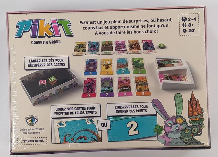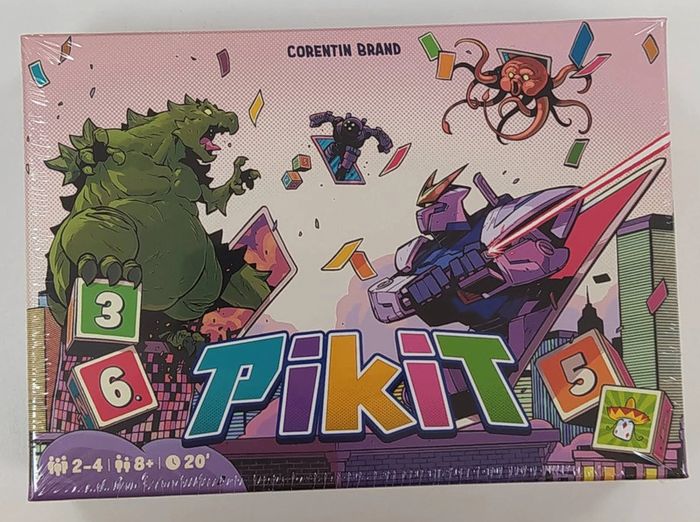 Jeu de société sous emballage - Prix Ferme Français à partir de 8 ans moins de 30mn 2 à 4 joueur(s) Utilisez les dés pour récupérer des Mechas et des Kaijus ! Dans Pikit, lancez les deux dés, puis jouer certaines de vos cartes pour utiliser leurs pouvoirs : relancer un dé, prendre une carte au hasard chez un adversaire, annuler l’effet d’une carte, etc... Ensuite, faites l’acquisition de nouvelles cartes selon les résultats obtenus aux dés : carte de même valeur que chaque dé, que leur total ou que leur différence. Vous avez un double ! L’occasion de récupérer l’un des puissants Mecha ou de tenter de le voler à vos adversaires. Quand la pioche est épuisée, on fait le total de ses points, en fonction de toutes ses cartes posées, et des bonus et malus reçus en cours de partie. Le joueur ayant le plus haut score l’emporte. Ludipresta