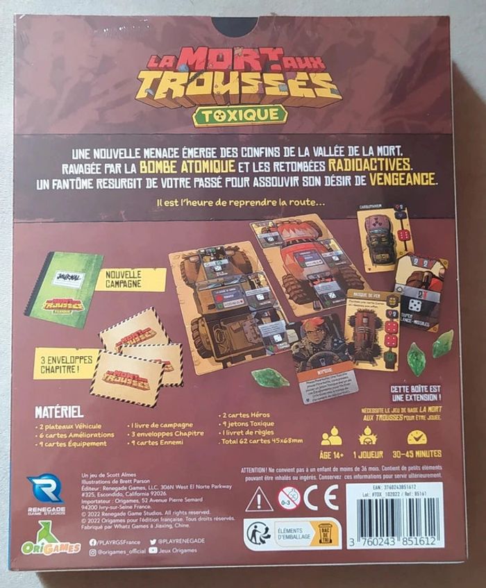 Extension sous emballage - Prix ferme Possibilité d'acheter le lot pour 47,50 € (jeu de base + extension) Jeu solo dès 10 ans Une nouvelle menace émerge des confins de la vallée de la mort, ravagée par la bombe atomique et les retombées radioactives. Un fantôme resurgit de votre passé pour assouvir son désir de vengeance. Customisez vos nouvelles bagnoles, faites de vos ennemis un tas de ferraille.Survivez 3 manches et défoncez les nouveaux Boss de fin de niveau.Enchainez les 3 chapitres inédits de la campagne finale. Nécessite le jeu de base La Mort aux Trousses. Ludipresta