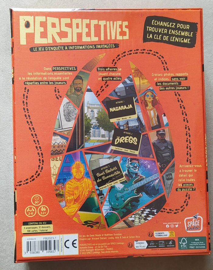 Jeu de société sous emballage - Prix Ferme Français à partir de 12 ans 1 à 2h 2 à 6 joueur(s) Jeu d'enquête et de communication. Une expérience ludique unique Echangez pour trouver ensemble la clé de l'énigme ! Résolvez les enquêtes en équipe. Dans Perspectives, chaque joueur détient des informations clés sous forme de photographies, rapports et autres indices. Travaillez ensemble, partagez vos observations et résolvez les trois enquêtes en quatre volets qui n’attendent que vous pour être élucidées. Un jeu coopératif encourageant le travail d’équipe Des règles simples et un tutoriel inclus Des enquêtes immersives Des scénarios pour voyager à travers le monde Contenu : 3 enveloppes 12 dossiers 108 cartes 1 tutoriel Ludipresta