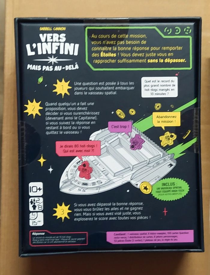 Jeu de société sous emballage, prix ferme 2 à 8 joueurs dès 10 ans Rapprochez-vous le plus possible de la bonne réponse Chacun leur tour, les joueurs vont embarquer dans le vaisseau spatial en proposant une réponse à une question insolite: la réponse est forcément un nombre qu'il ne faut surtout pas dépasser! A tout moment, les joueurs les plus sceptiques peuvent finalement décider de descendre du vaisseau s'ils pensent que la réponse correcte est dépassée. Puis on regarde la bonne réponse et les joueurs récoltent ou non des points Étoiles en fonctions des enchères qui ont été faites. Le joueur qui a le plus de points au bout de 8 cartes Questions remporte la victoire ! Ludipresta