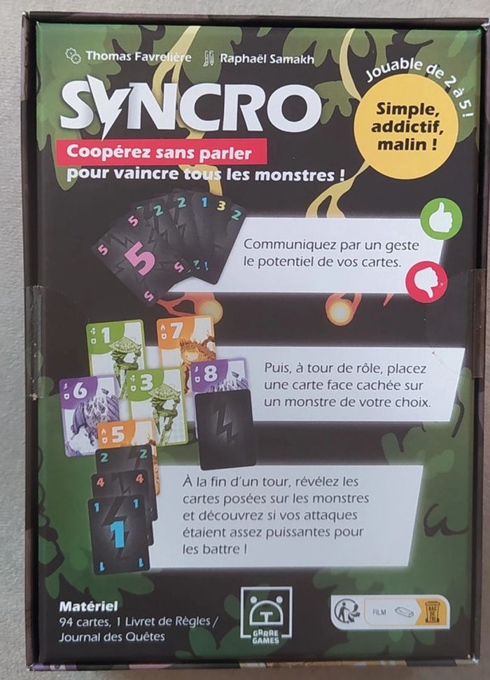 Jeu de société sous emballage - Prix Ferme Français à partir de 10 ans moins de 30mn 2 à 5 joueur(s) Dans Syncro, coopérez sans parler pour vaincre tous les monstres Syncro est un jeu dans lequel vous n’avez pas le droit de communiquer avec vos partenaires de jeu ! Les règles sont simples, la prise en main est rapide, rendant le jeu addictif ! Vous allez poser des cartes pour neutraliser des monstres, mais il vous faudra synchroniser la gestion de votre main de cartes car vous ne pourrez vous parler pendant le jeu. Au début du jeu, communiquez par un geste le potentiel de vos cartes. À tour de rôle, placez une carte face cachée sur un monstre de votre choix. À la fin d’un tour, révélez les cartes posées sur les monstres et découvrez si vos attaques étaient assez puissantes pour les battre ! Ludipresta