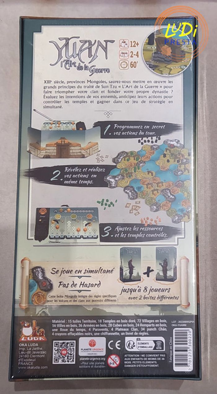 Jeu de société sous emballage - Prix Ferme Français à partir de 12 ans 30mn à 1h 2 à 4 joueur(s) XIIIème siècle, provinces chinoises, saurez-vous mettre en œuvre les grands principes du traité de Sun Tzu "l'Art de la Guerre" pour faire triompher votre clan et fonder votre propre dynastie ? Évaluez les intentions de vos ennemis, anticipez leurs actions pour contrôler les temples et le continent asiatique dans ce jeu de stratégie en simultané. Un jeu de réflexion et de stratégie Chaque général va programmer ses actions derrière son écran, les révéler et les réaliser sur le plateau central simultanément . Une fois les colonisations, fortification, batailles effectués, chaque général ajuste les niveaux de contrôles de provinces et de temples pour préparer le prochain tour ! Le nombre de temples à contrôler pour gagner la partie réduisant au fil des tours, la victoire devient de plus en plus accessible à chacun… Mais l’art de la guerre implique une gestion très précise de son armée, de ses colons et des ses fortifications, saurez vous trouvez le bon équilibre ?! Cette boite de Yuan : L'Art de la Guerre vous propose 4 généraux mongols, vous pouvez la combiner avec la boite de Yuan : L'Art de la Guerre : Chine, pour des parties jusqu'à 8 joueurs. Ludipresta