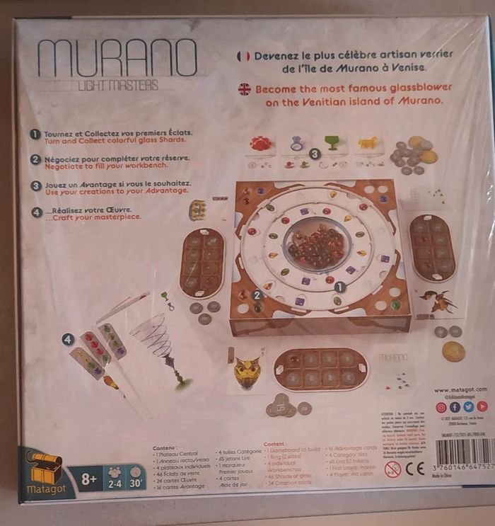 Jeu de société sous emballage - Prix ferme 2 à 4 joueurs dès 8 ans Deviendrez-vous un grand maître verrier ? Dans Murano Light Masters, devenez un maître verrier, obtenez des éclats de verres colorés et transformez-les en magnifiques œuvres d'arts ! Rappelez-vous cependant qu'il vous faudra le nombre exact d'éclats pour produire vos pièces, ni plus ni moins, si vous voulez satisfaire vos clients. Avec chaque réalisation, vous honorez les maîtres de l'Ile Vénitienne qui vous offriront le secret de leurs techniques secrètes. Au cours de la partie À votre tour, tournez le sélecteur dans le sens horaire et récupérez vos éclats puis choisissez avec soin votre action de négoce : L'échange La vente L'achat d'éclats de verre au marché N'oubliez pas que vous pouvez modifier l'ordre de vos cartes créations et optimiser votre jeu en faisant tourner l'anneau. Puis si vous avez les éclats nécessaires sur votre plan de travail, vous pouvez compléter un, voire deux chefs-d'œuvre. L'utilisation astucieuse des cartes avantages vous aidera, mais rappelez-vous que la compétition est rude sur ces îles et qu'il faudra garder un œil sur les actions de vos adversaires. Ludipresta