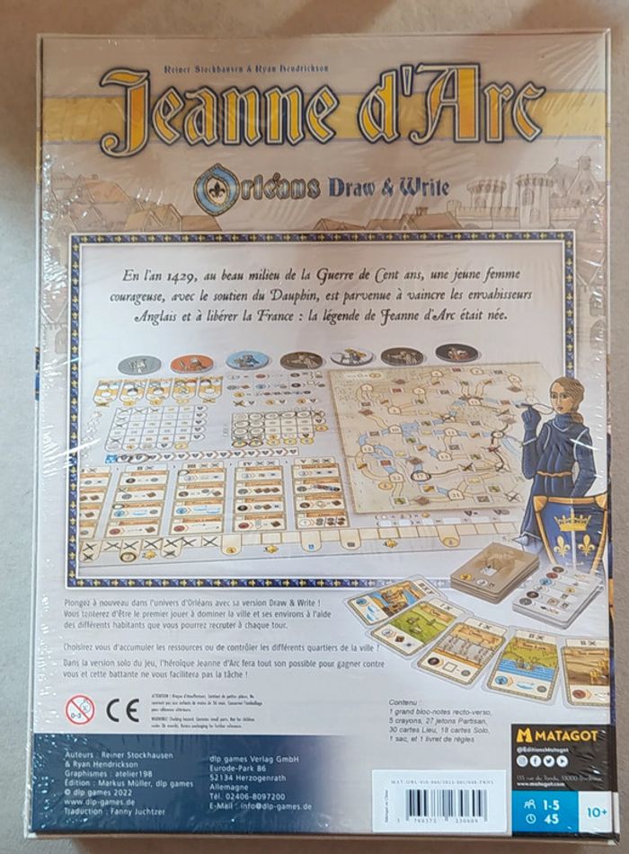 Jeu de société sous emballage - Prix ferme 1 à 5 joueurs dès 12 ans Un Draw&Write dans l'univers d'Orléans. Dans Orléans - Jeanne d'Arc , 1 à 5 joueurs devront choisir des partisans qui les aideront à se déplacer en France, à rassembler des marchandises, à construire des bâtiments, à établir des commerces, à gagner de l'argent et à contribuer à des actions bénéfiques. Le joueur utilisera au mieux les partisans qu'il a choisi marquera le plus de points. À chaque tour, des tuiles partisans sont tirées du sac. À tour de rôle, les joueurs choisissent leur partisan et effectuent les actions qui correspondent à la tuile. Une fois que tous les partisans ont été choisis, le sac est re mélangé jusqu'à ce que vous ayez épuisé un sac par joueur.