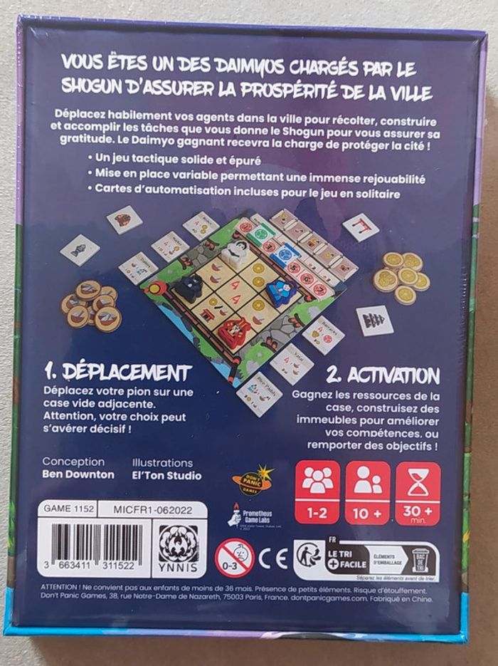 Jeu de société sous emballage - Prix ferme 1 à 2 joueurs dès 10 ans Vous êtes un des daimyos chargés par le shogun d’assurer la prospérité de la ville. Déplacez habilement vos agents dan la ville pour récolter, construire et accomplir les tâches que vous donne le Shogun pour vous assurer sa gratitude. Le Daimyo gagnant recevra la charge de protéger la cité ! Déplacez votre pion sur une case vide adjacente. Attention, votre choix peut s’avérer décisif ! Gagnez les ressources de la case, construisez des immeubles pour améliorer vos compétences, ou remporter des objectifs.