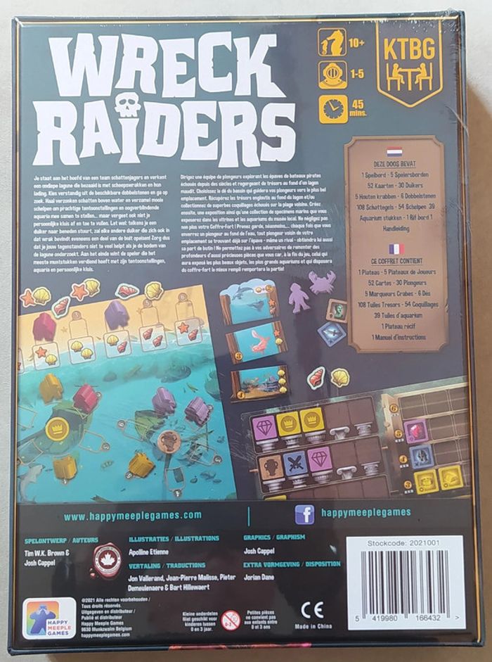 Jeu de société sous emballage - prix ferme 1 à 5 joueurs dès 10 ans Wreck Raiders - Le Jeu Wreck Raiders est un jeu de placement d'ouvrier, co-créé par Tim W. K. Brown et Josh Cappel, de 1 à 5 joueurs dès 10 ans, pour des parties d'environ 45 minutes, édité par Happy Meeple Games. Allez-vous risquer de laisser un rival participer à votre course pour obtenir le trésor que vous voulez, ou pouvez-vous trouver un moyen de vous procurer un butin supplémentaire ? Wreck Raiders - Comment ça marche Choisissez un dé dans la réserve, puis envoyez l'un de vos plongeurs à n'importe quel endroit du plateau avec ce numéro. Mais attention : le spot que vous choisirez aidera tous les plongeurs des spots à côté de vous, qu'ils soient amicaux ou non. Exposez vos trésors pour construire des expositions de musée ou envoyez-les dans votre coffre-fort pour d'énormes opportunités de score... N'oubliez pas de visiter la plage à proximité pour ramasser des babioles échouées et les dépenser pour construire de superbes aquariums. À la fin du jeu, vous gagnerez des pièces pour vos expositions, votre coffre-fort et vos aquariums. Le joueur avec le plus de pièces gagne !