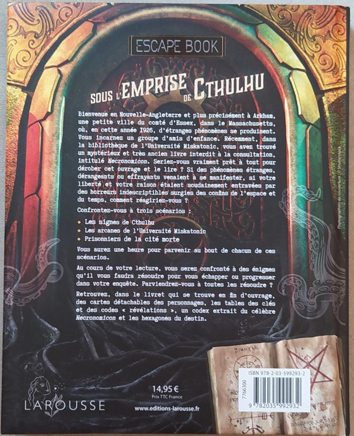 Escape book neuf sous emballage - Prix ferme Le lecteur incarne ici un héros aux prises avec Cthulhu, une monstrueuse entité cosmique qui menace de se réveiller et de détruire la planète. Ce sont pas moins de 3 enquêtes aux scénarios distincts qui attendent le lecteur qui devra pour cela résoudre des énigmes les plus retorses les unes que les autres.