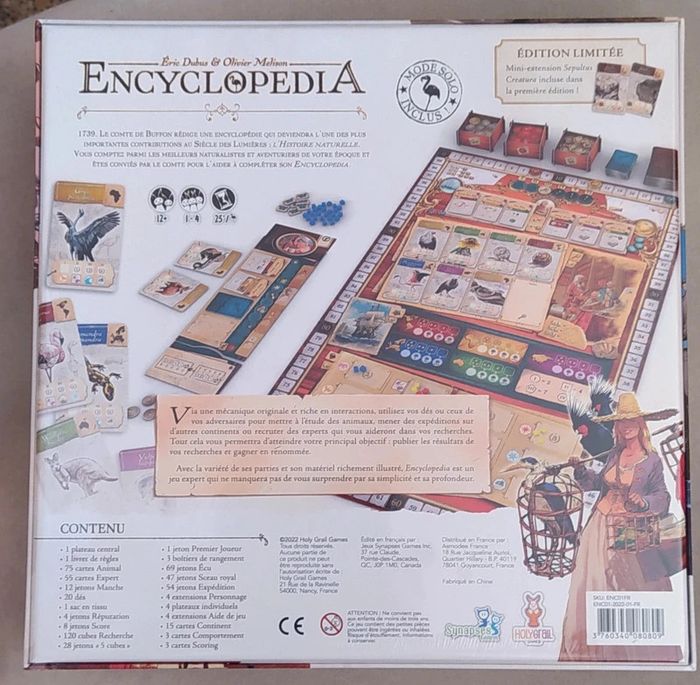 Jeu neuf sous emballage Retrouvez tous les jeux disponibles ici : https://www.myludo.fr/#!/profil/ludipresta-45241 Des naturalistes en herbe se lancent dans l'étude des créatures les plus fascinantes du monde ! Nous sommes en 1739, et en tant que naturalistes et aventuriers en herbe, vous avez été engagés par le Comte de Buffon - le prédécesseur de Darwin - pour l'aider à créer la première encyclopédie d'histoire naturelle. Pour ce faire, vous devrez mener des recherches, organiser des expéditions ambitieuses et publier des études sur les créatures les plus fascinantes du monde ! À chaque tour, les joueurs lancent des dés et utilisent les valeurs et/ou les couleurs de leurs dés (ou de ceux des autres joueurs) afin d’engager une variété d’actions : collecter des fonds auprès de la banque, demander de l’aide à l’académie royale, faire des recherches sur les animaux, partir en expédition et plus encore ! Les joueurs gagnent non seulement des points en publiant leurs recherches, mais aussi en engageant des experts, en améliorant leur réputation auprès de leurs pairs et en en optimisant leurs actions. Le joueur qui a le plus de points à la fin du jeu gagne. Encyclopédia offre une multitude de moyens de contrer le côté aléatoire de vos jets de dés. En plus de pouvoir dépenser différents jetons pour changer la valeur ou la couleur d'un dé, les joueurs ont plus que leur propre dé à choisir, car les dés des autres joueurs peuvent aussi être utilisés ! Prendre un dé du plateau d'un autre joueur ne coûte rien, mais le joueur ciblé gagne un bonus.