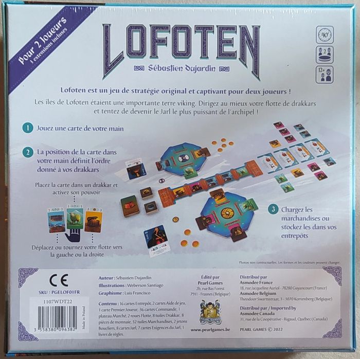 Jeu de société neuf sous emballage - Prix ferme Retrouvez tous les jeux disponibles ici : https://www.myludo.fr/#!/profil/ludipresta-45241 2 joueurs dès 12 ans Lofoten, un jeu de stratégie original pour 2 joueurs ! Aujourd'hui considérés comme l'un des plus beaux archipels du monde, les Îles Lofoten étaient une importante terre viking. Sachant s'adapter à diverses situations, les Vikings n'étaient pas seulement des colons et des bâtisseurs pacifiques, mais aussi des envahisseurs et des marchands habiles. Dirigez au mieux de votre flotte de drakkars et tentez de devenir le Jarl le plus puissant de l'archipel ! Dans Lofoten, vous devez charger des marchandises du marché dans vos drakkars et les ramener à votre clan. Chaque type de marchandise vous donnera un avantage sur le Jarl adverse. Quelle que soit la situation, votre objectif est de gagner plus de PP (points de pouvoir) que le Jarl adverse lors du décompte de point final, pour remporter la partie.