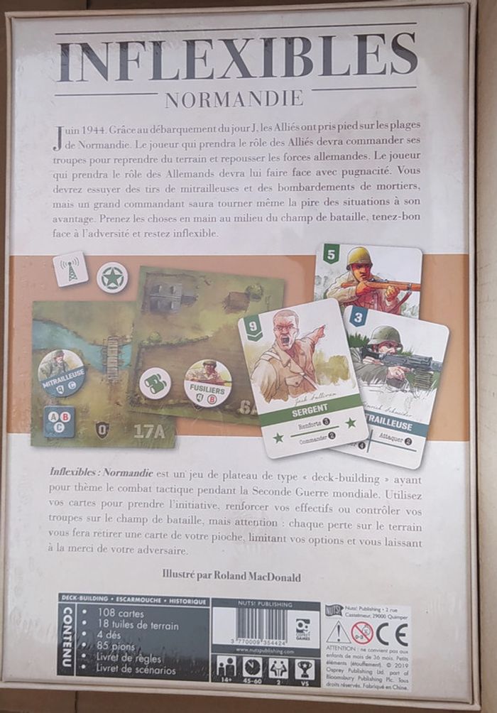 Jeu neuf sous emballage - prix ferme Retrouvez tous les jeux disponibles ici : https://www.myludo.fr/#!/profil/ludipresta-45241 2 joueurs dès 14 ans Revivez le débarquement en Normandie dans ce jeu de deckbuilding pour 2 joueurs Inflexibles : Normandie est un jeu de deckbuilding qui vous place, vous et votre adversaire, aux commandes des forces américaines ou allemandes, combattant à travers une série de missions essentielles à l'issue de la Seconde Guerre mondiale. Le joueur qui prendra le rôle des Alliés devra commander une section d'infanterie pour reprendre du terrain et repousser les forces allemandes. Le joueur qui prendra le rôle des allemands devra lui faire face avec pugnacité. Vous devrez essuyer des tirs de mitrailleuses et des bombardements de mortiers. Ce sera à vous de tourner la situation à votre avantage. Prenez les choses en main au milieu du chaos de la bataille, tenez-bon face à l’adversité et restez inflexible. Au cours de la partie Utilisez vos cartes pour prendre l'initiative, renforcer vos forces ou contrôler vos troupes sur le champ de bataille. Un leadership fort peut inverser le cours de la bataille en votre faveur, mais des décisions imprudentes pourraient s'avérer catastrophiques car chaque victime que vous prenez enlève une carte de votre deck. Prenez les commandes au milieu du chaos de la bataille, restez ferme face à l'opposition et ne vous laissez pas intimider.
