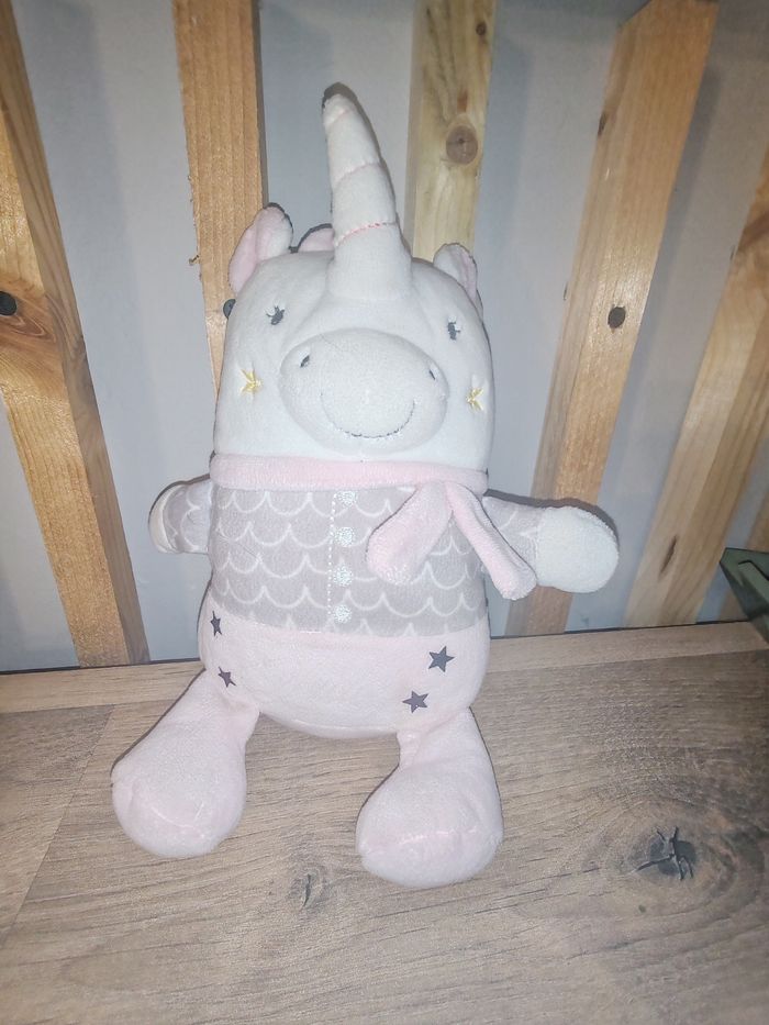 Licorne rose et grise 20cm environ MOTS D'ENFANTS lerclerc Étiquette de la marque présente 9.90 euros Envoi en relais