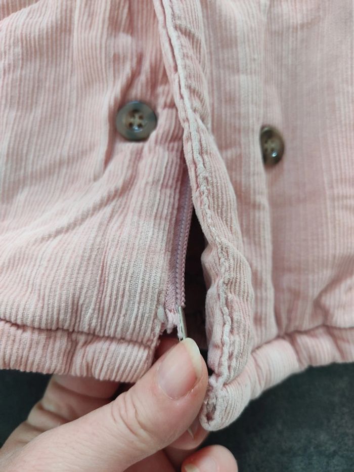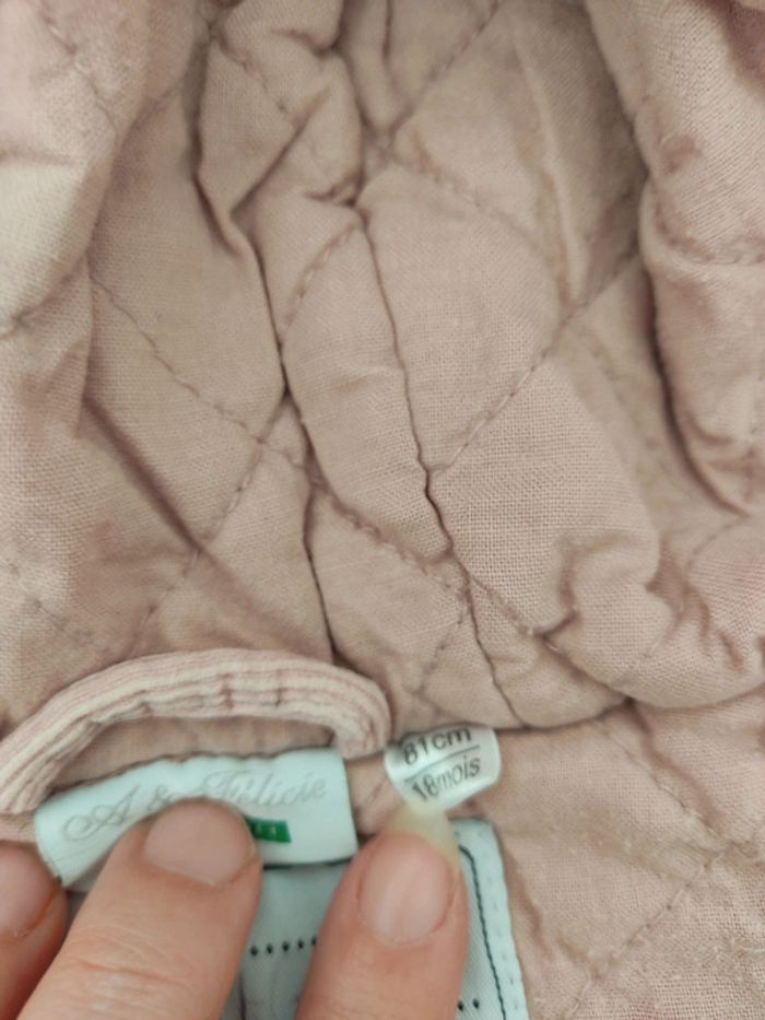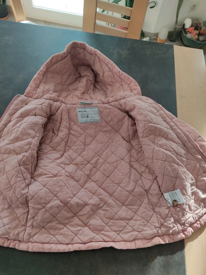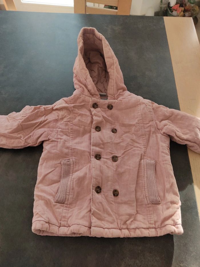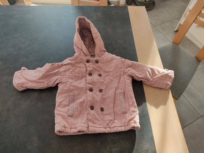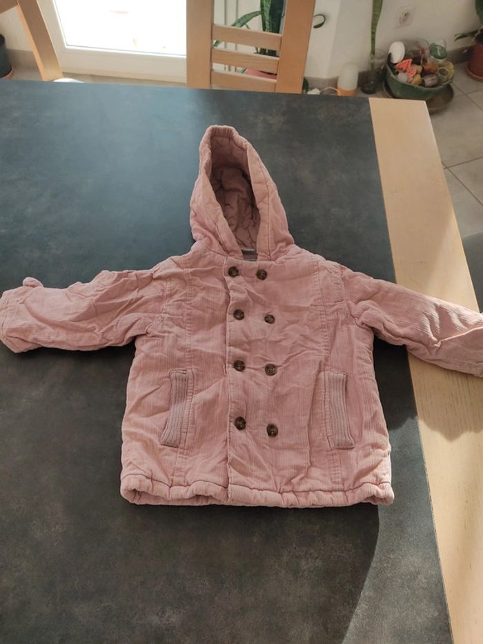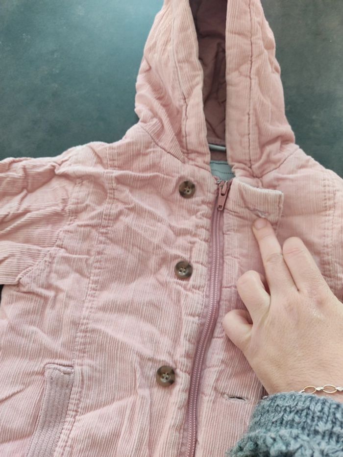 veste chaude avec capuche rose aspect velours. Marque Vertbaudet. 2 poches. Fermeture éclair et boutons. Bon état Mot clé : parka, doudoune, manteau, capuchon Défauts: le bas de la fermeture éclair est un peu décousu mais on arrive tout de même à fermer. Nom écrit sur l étiquette.