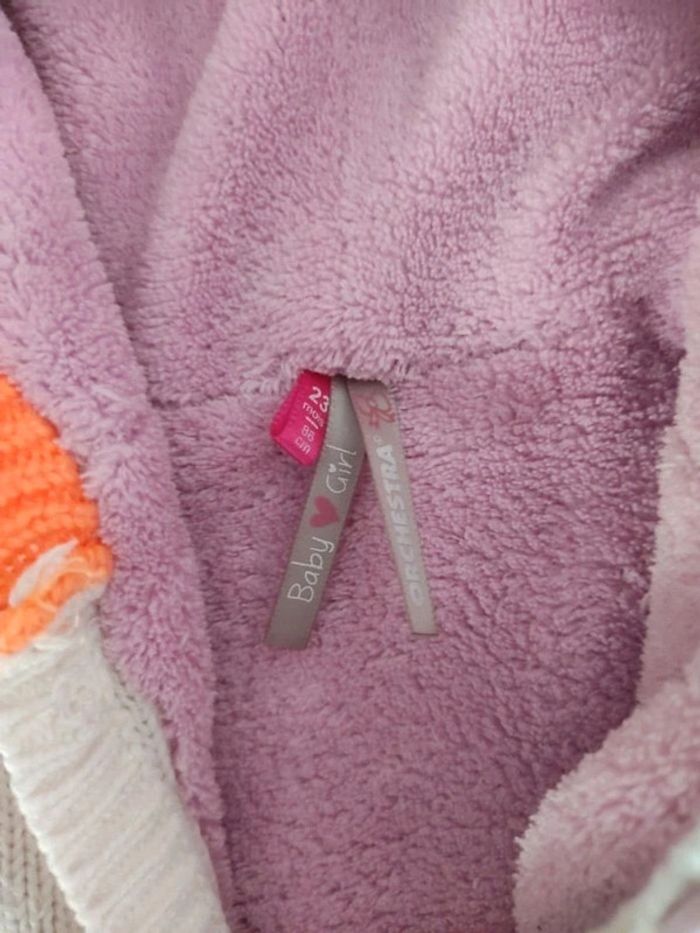 Jolie cape marque orchestra taille 23 mois avec capuchon. Intérieur chaud doublure polaire. Confortable et facile à enfiler. Marque d usure à un bouton et le petit bouton côté manche droite à recoudre. Reste en très bon état.
