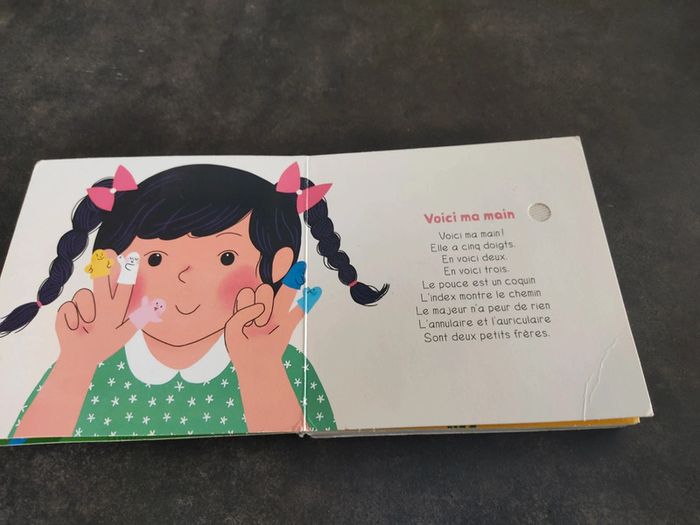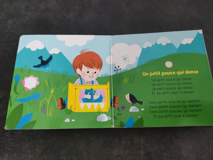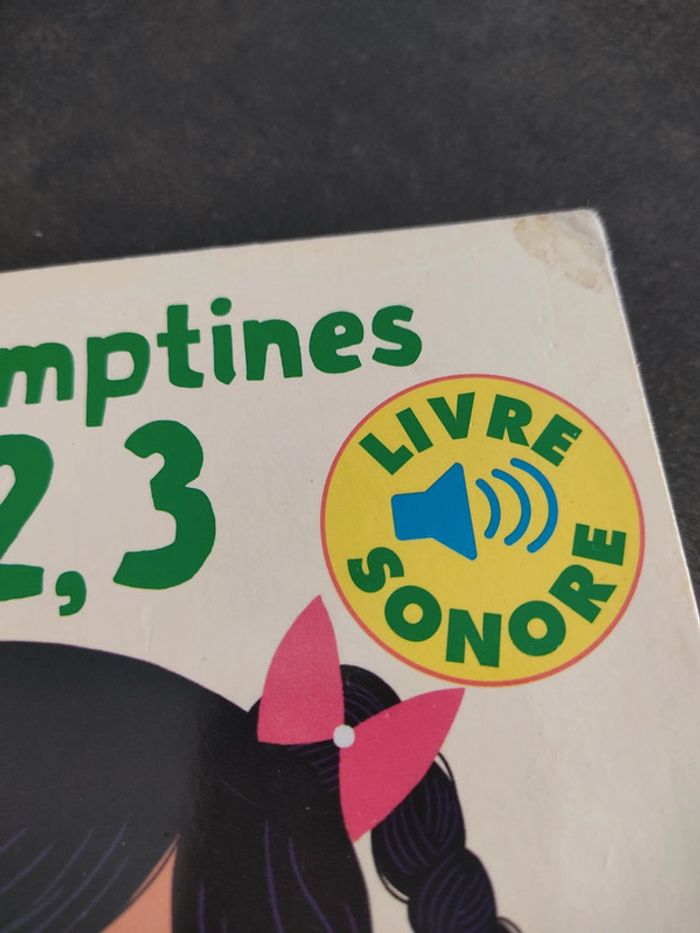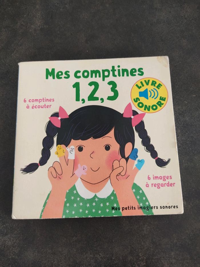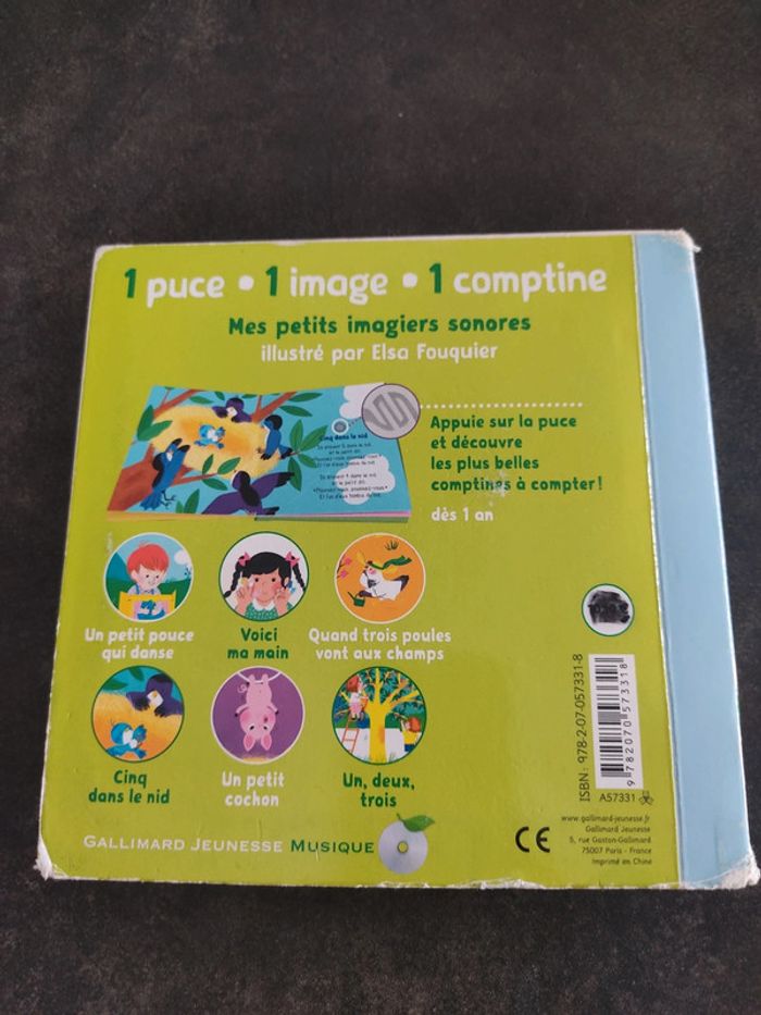 Livre bébé : mes comptines 1,2,3. Gallimard Jeunesse. Illustré par Elsa Foulquier Attention : la partie sonore ne fonctionne pas. À regarder comme un livre non sonore Page cartonnée Comptine : - un petit pouce qui danse -voici ma main - quand trois poules vont aux champs -cinq dans le nid - un petit cochon - un, deux, trois nous irons au bois