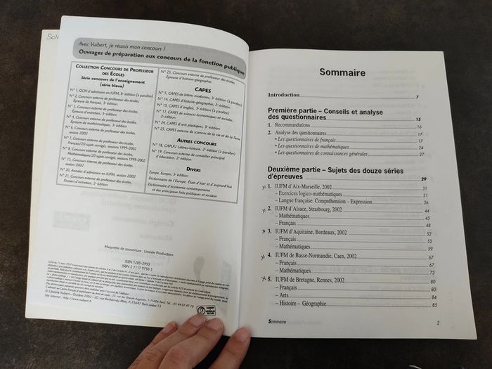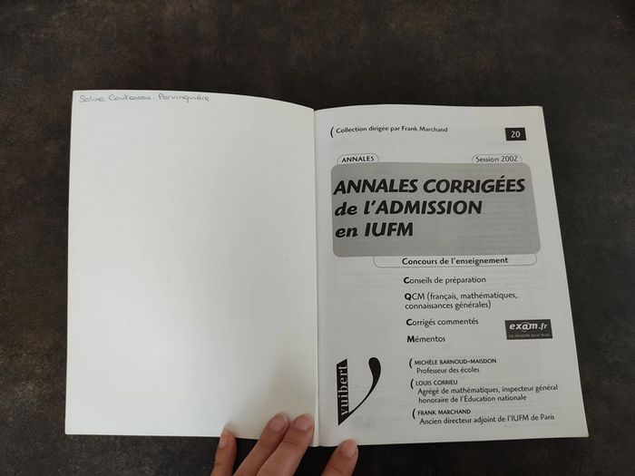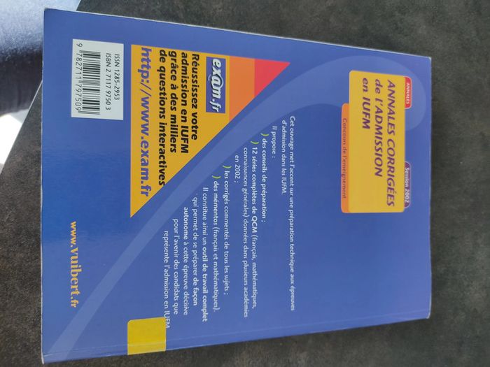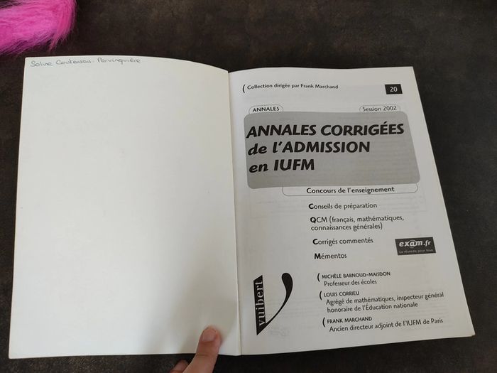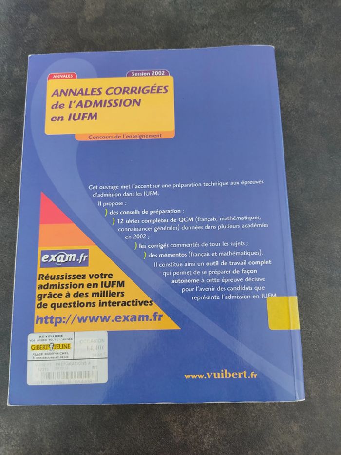 Annales corrigées de l admission en iufm session 2002 Édition Vuibert Pour devenir professeur des écoles. Les iufm sont les anciens inspe. Le livre a été utilisé, on peut voir quelques pages annotées ( cf photos ) mais cela ne gêne pas l utilisation.