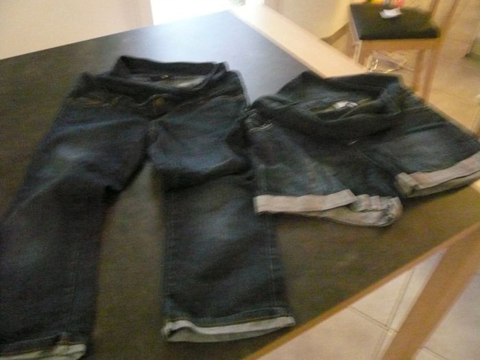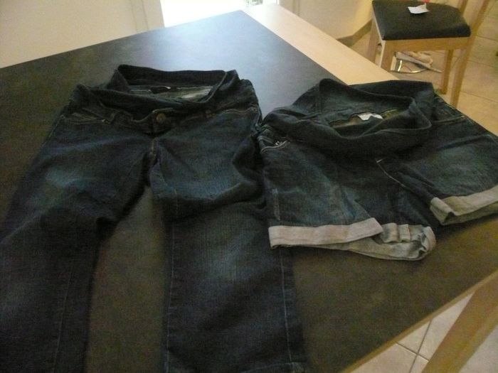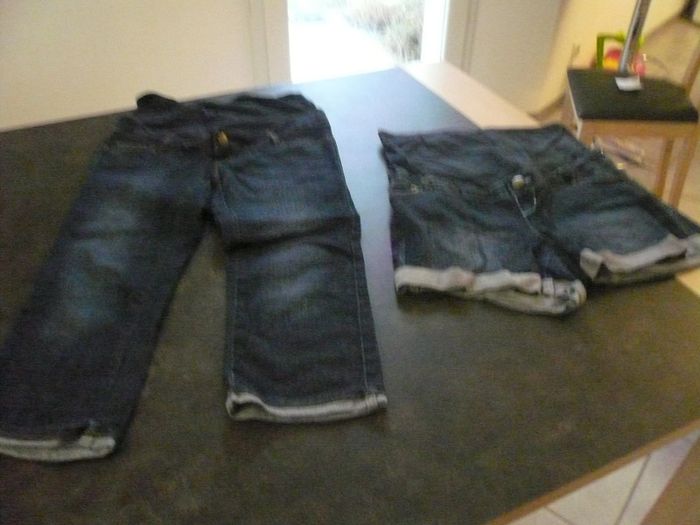 -pantacourt de maternité en jean bleu foncé avec large bande en maille pour le ventre taille 36 marque calin kalin (kiabi)= 5€ -short de grossesse en jean bleu foncé avec large bande en maille pour le ventre taille 40 marque calin kalin (kiabi)=5€ le lot de 2 = 9€