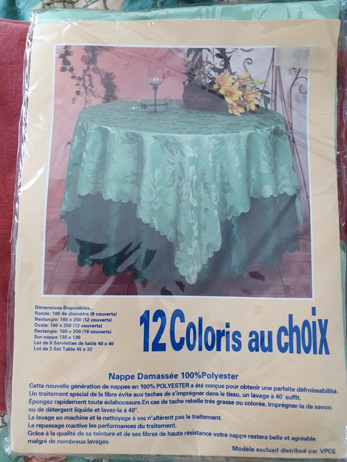 Nappe vert bouteille, bon état, quelques petites tâches Sur nappe vert clair neuve 180 cm de diamètre #flagadajoneslinge #nappe