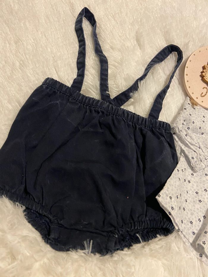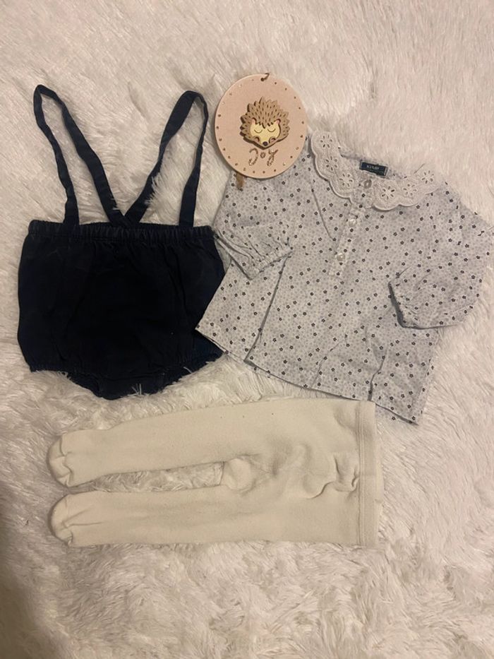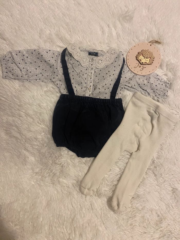 Description 🌸 : Adorable ensemble pour bébé, taille 1 mois. • Marque : Kiabi • État : Très bon état, aucun défaut (ni tâche ni trou). • Couleur : Blanc, noir/marine. • Détails supplémentaires : ensemble petit chemiser avec col, bomber salopette, et collant en taille 15-16. N’hésitez pas à me contacter pour plus d’informations ou des photos supplémentaires ! ☀️