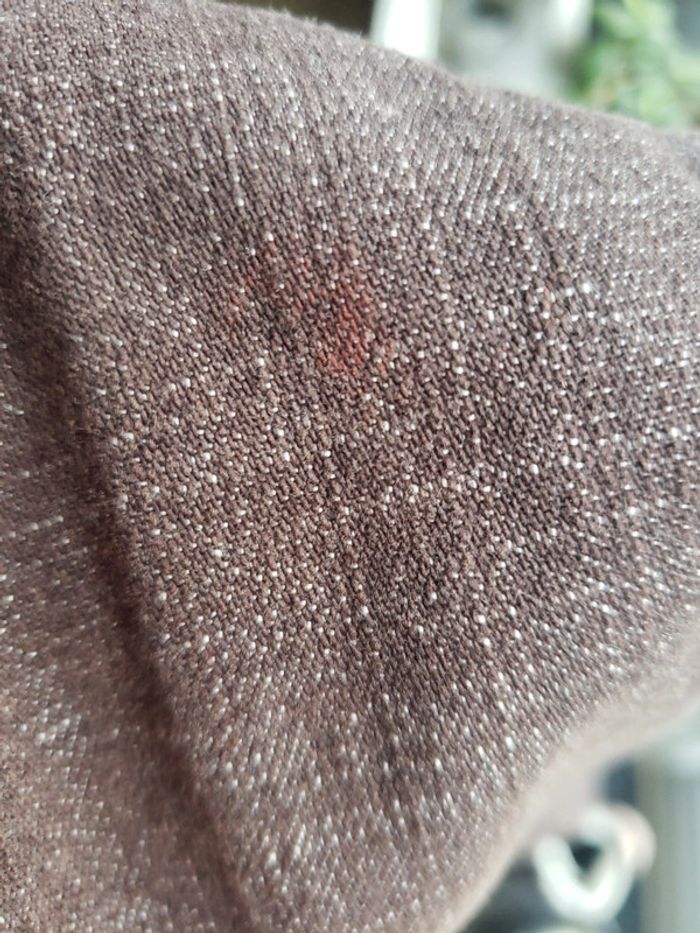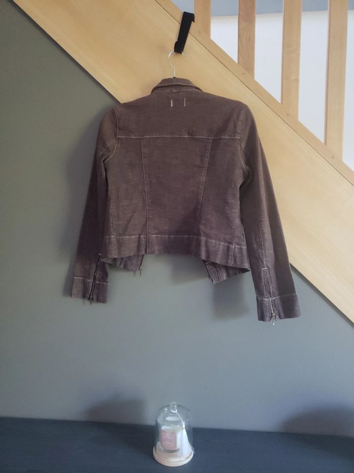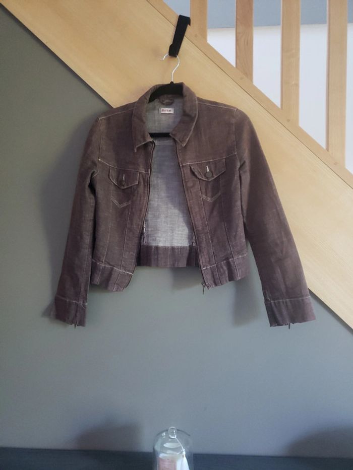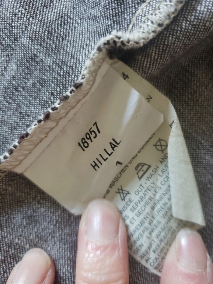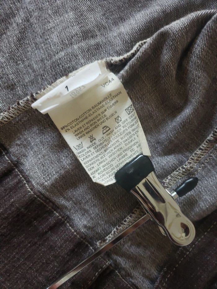 Peu portée Taille 1 correspond au 36-38 car c'est ce que je porte 😊 Style en jeans mais de couleur marron. Deux fausses poches devant Voir la dernière photo Je pense que c'est le tissu et non une tache