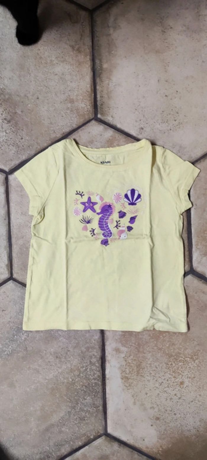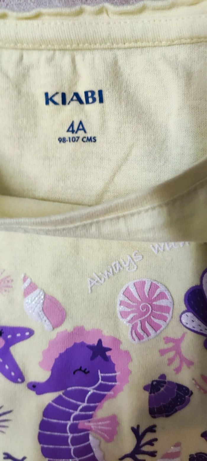 En parfait état. Avec motifs marins violet et fuschia dont un petit hippocampe. T-shirt jaune #4ansBecca