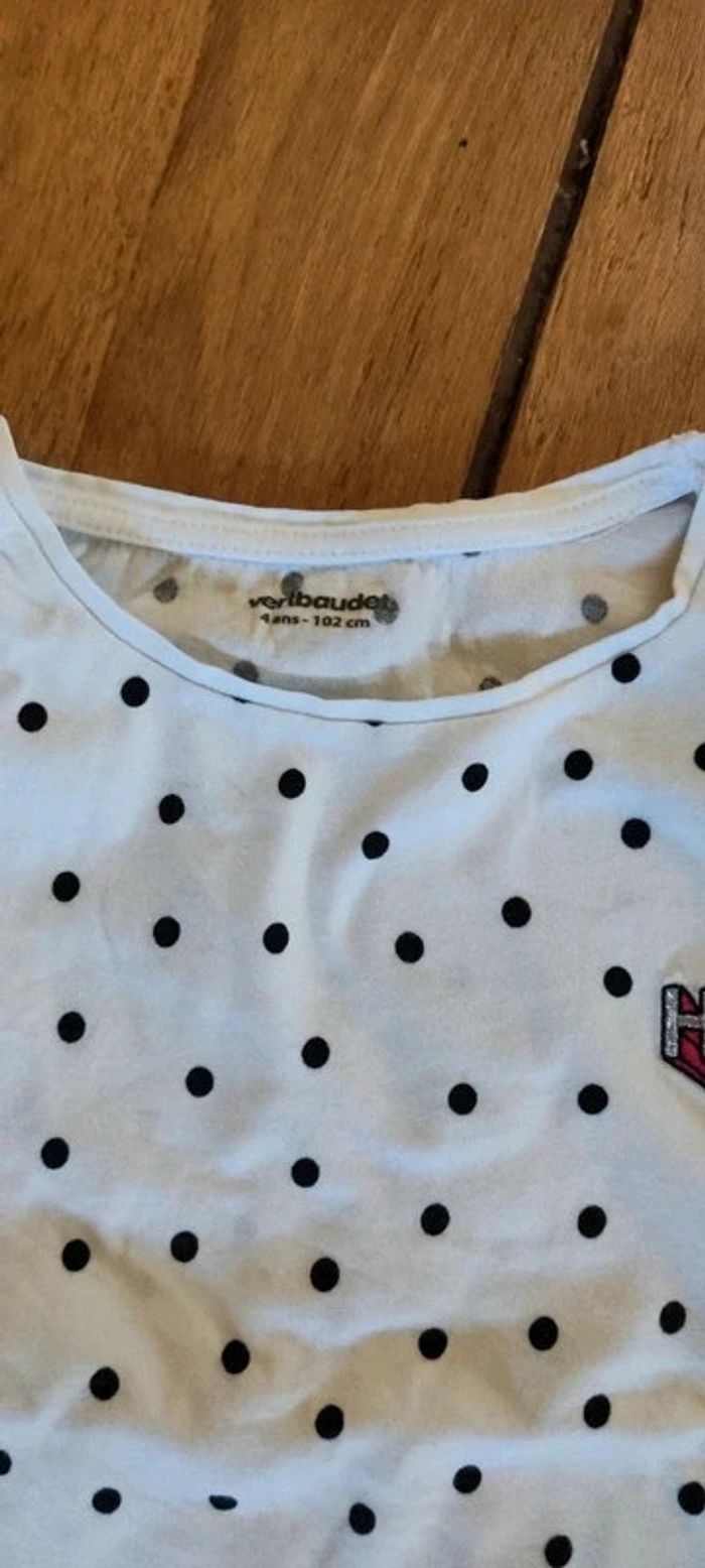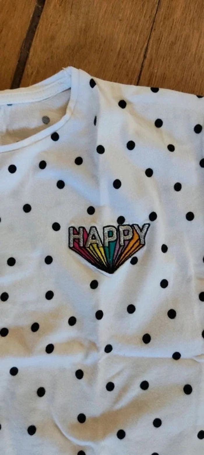 En très bon état. Pas de défaut à signaler Brodé "Happy" sur la poitrine Blanc à pois noirs.