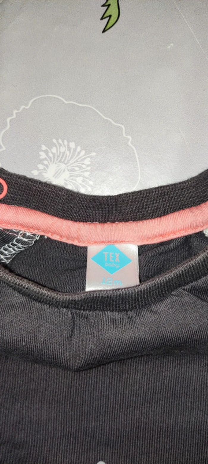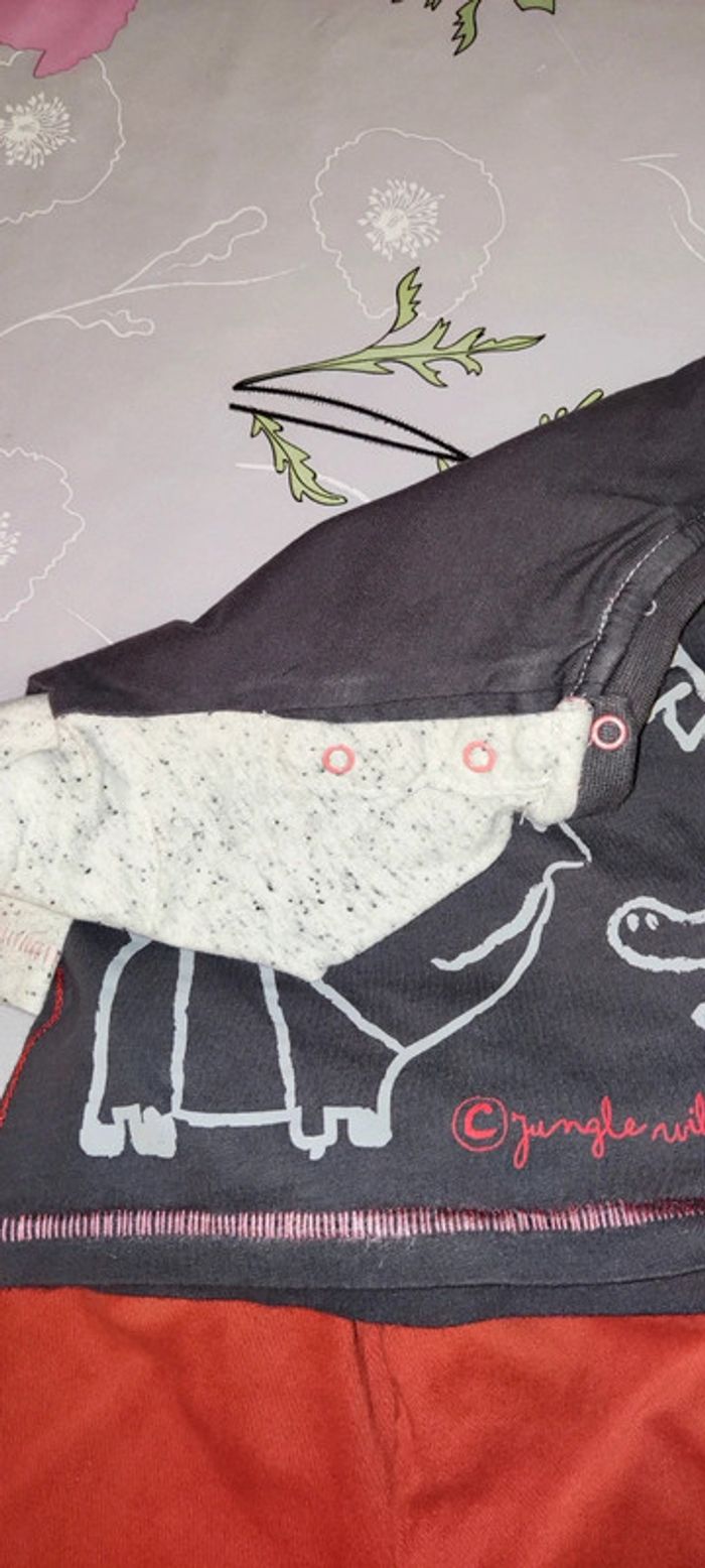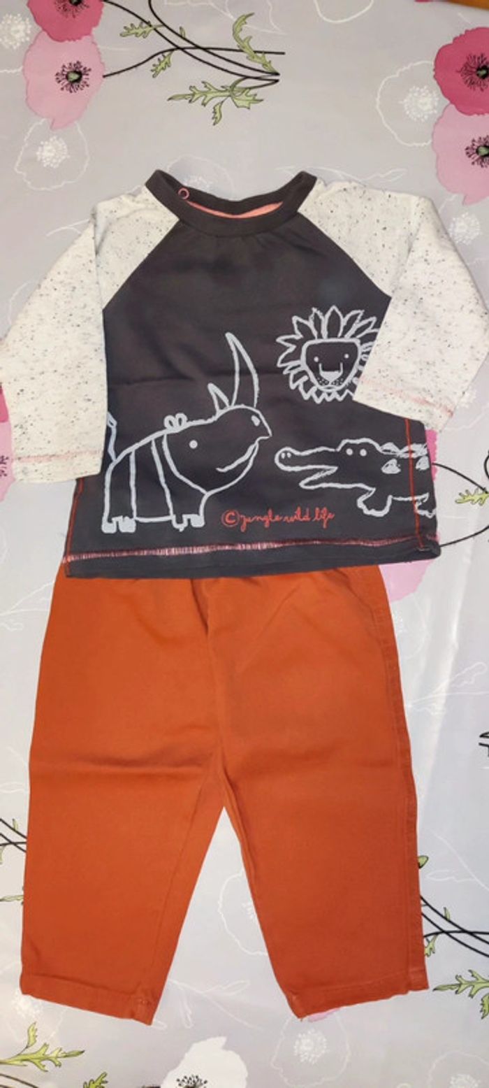 T shirt manche longue marron, gris avec des pointes d'orange, avec des dessins d'animaux de la savane dessus. Marque Tex Pantalon coton orange. Vont très bien ensemble même si au départ ce n'était pas un ensemble. #12moisGus