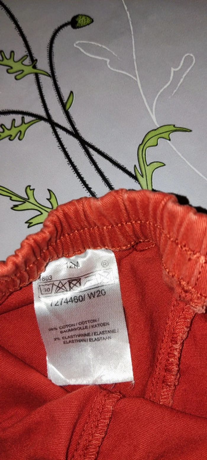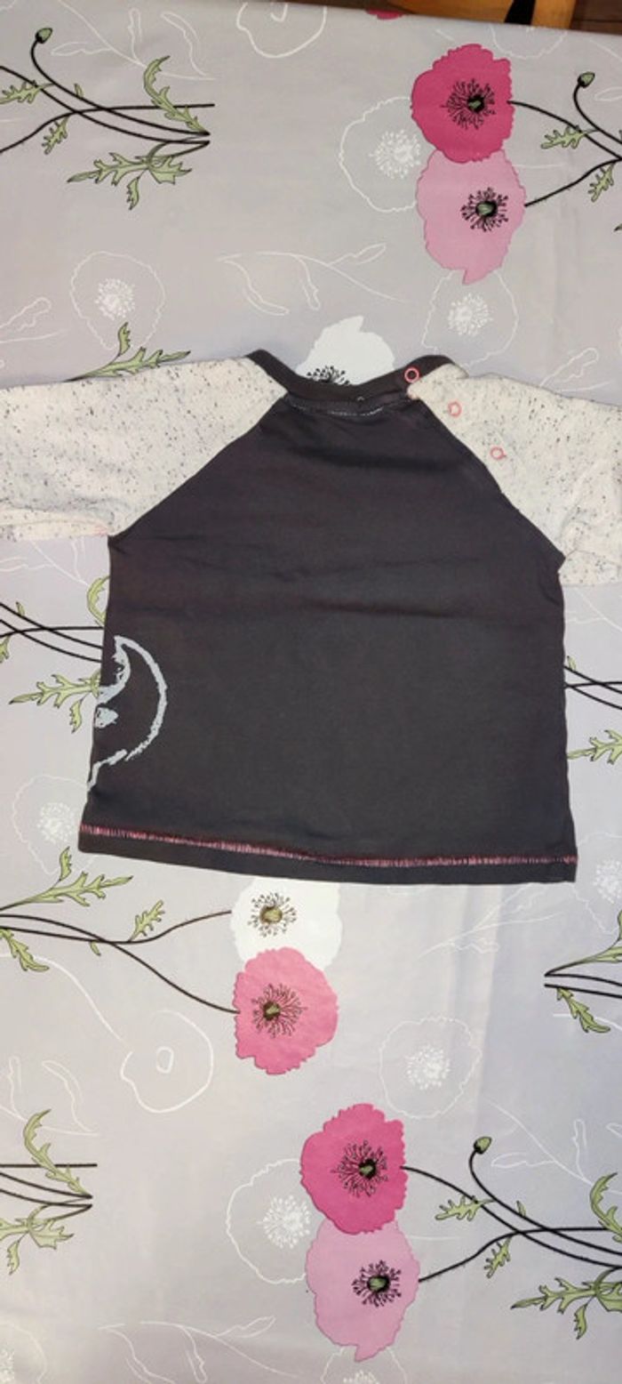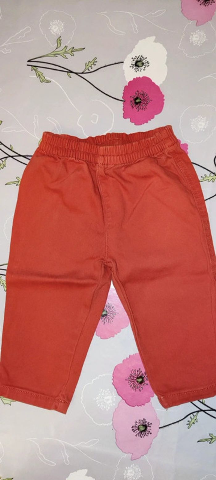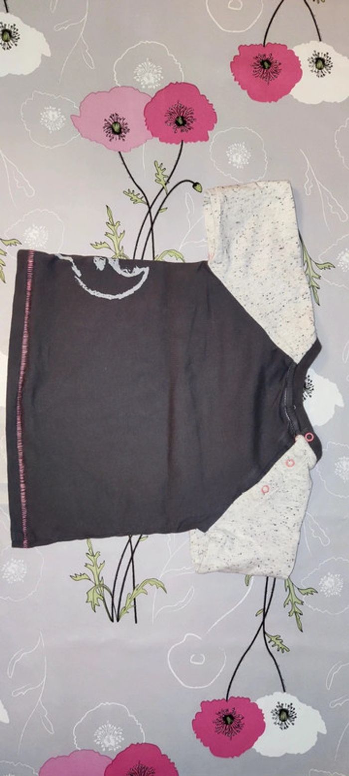 T shirt manche longue marron, gris avec des pointes d'orange, avec des dessins d'animaux de la savane dessus. Marque Tex Pantalon coton orange. Vont très bien ensemble même si au départ ce n'était pas un ensemble. #12moisGus