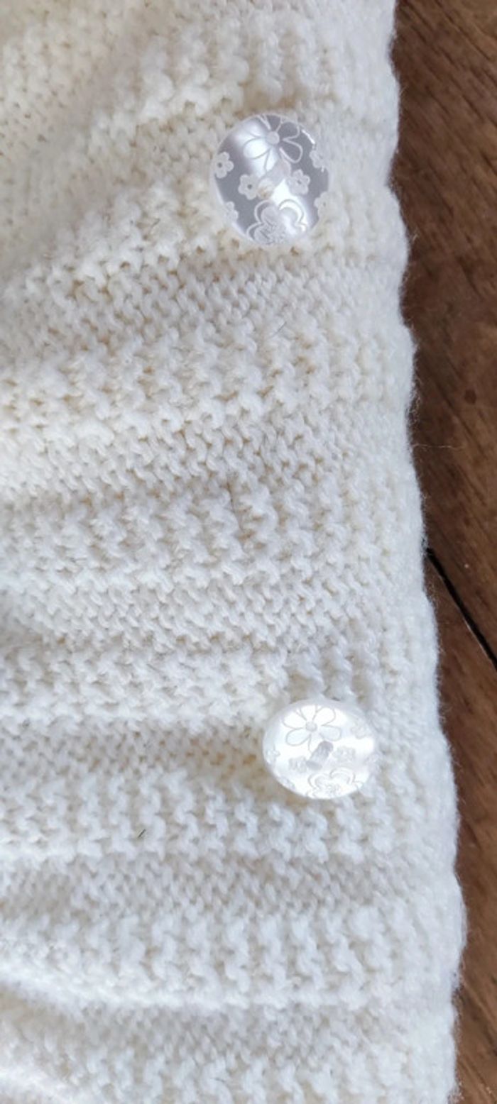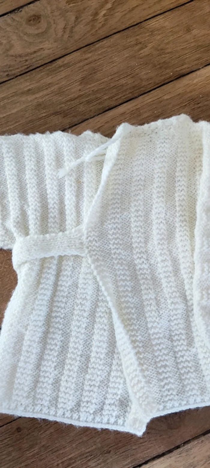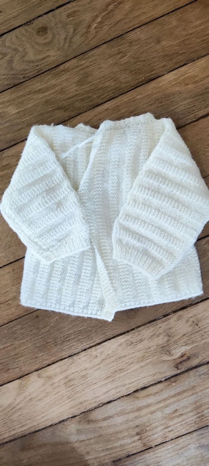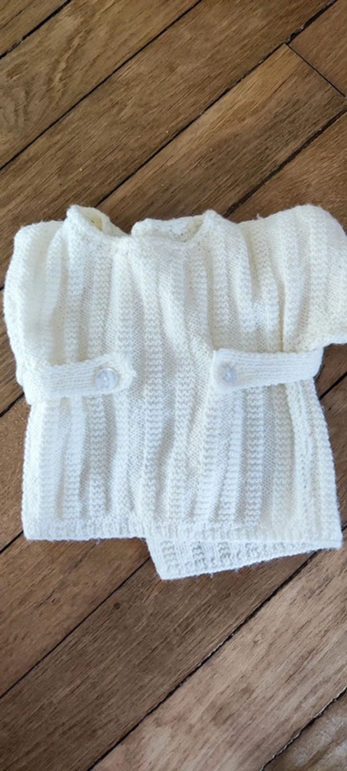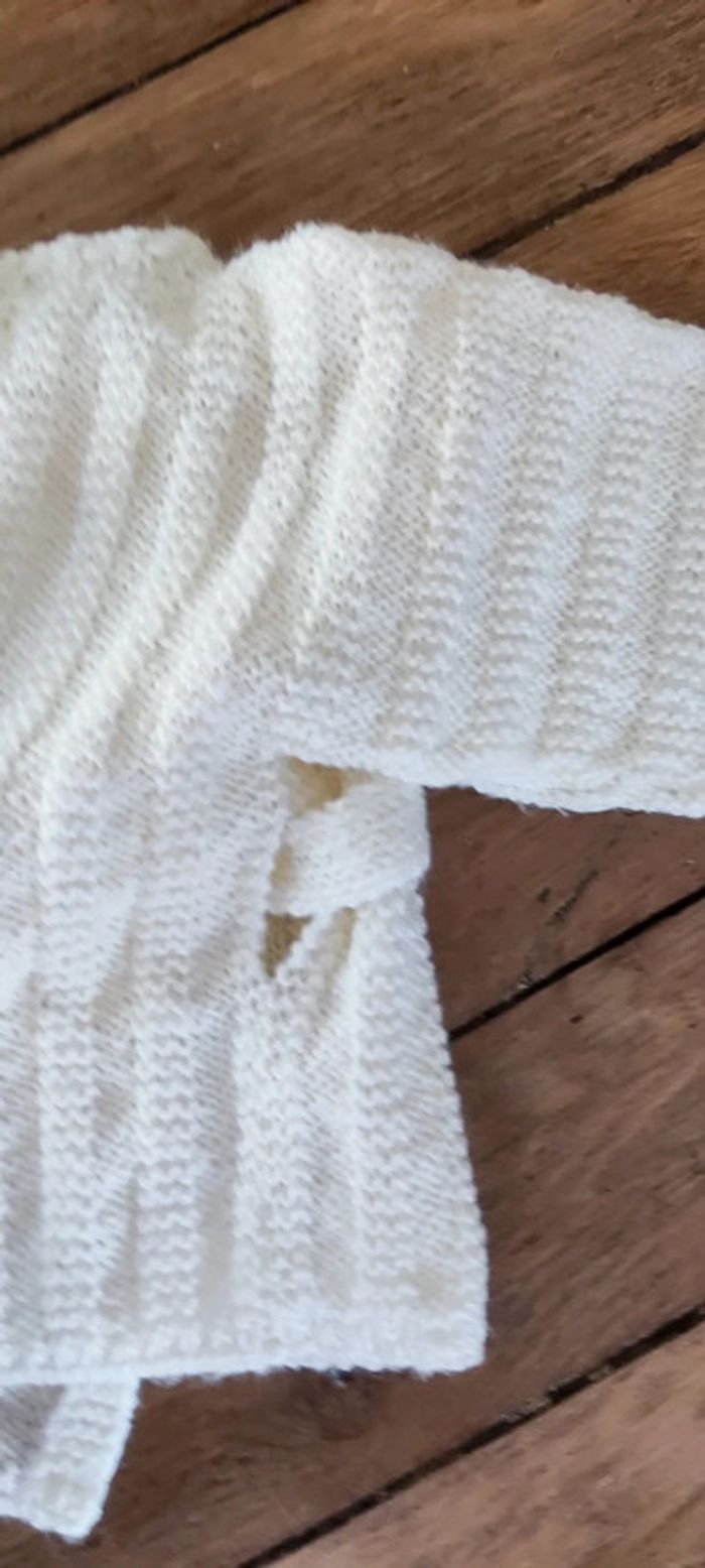 Pull en laine fait maison style cache coeur qui s'attache dans le dos. Idéal pour tenir chaud a bébé. La taille est difficile à déterminer. Je dirai 6 mois. Mais il sera peut être un peu grand mais mieux vaut grand que trop petit Couleur crème