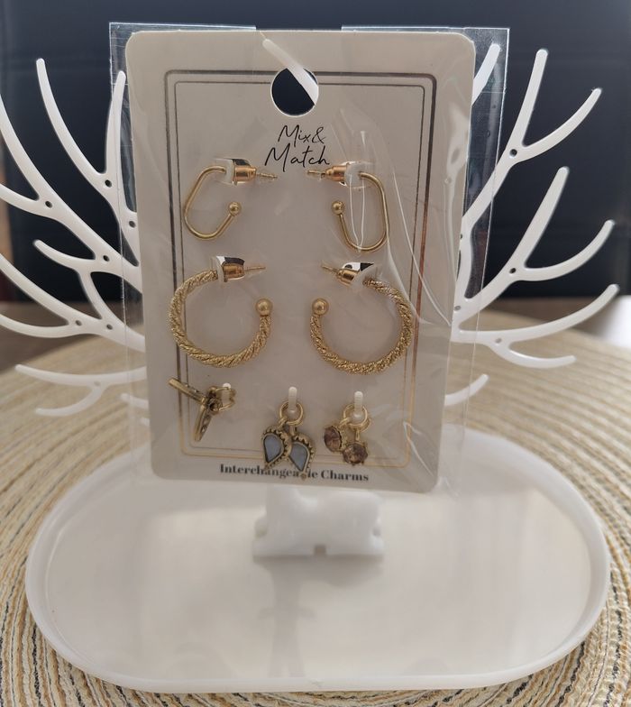 👒 Lot de 2 paires de boucles d'oreilles & 3 paires de breloques fantaisie. 👒 Marque : Mix & Match 👒 Neuf dans l'emballage d'origine
