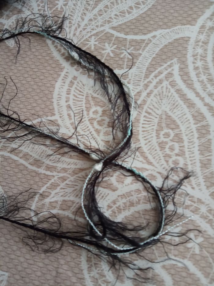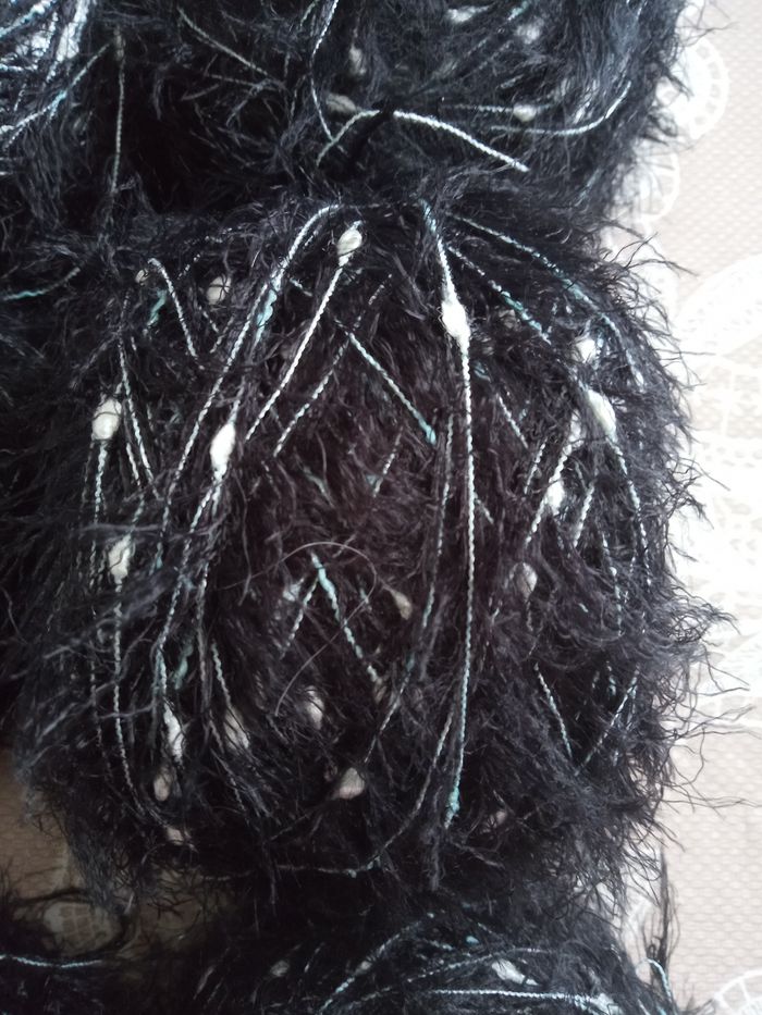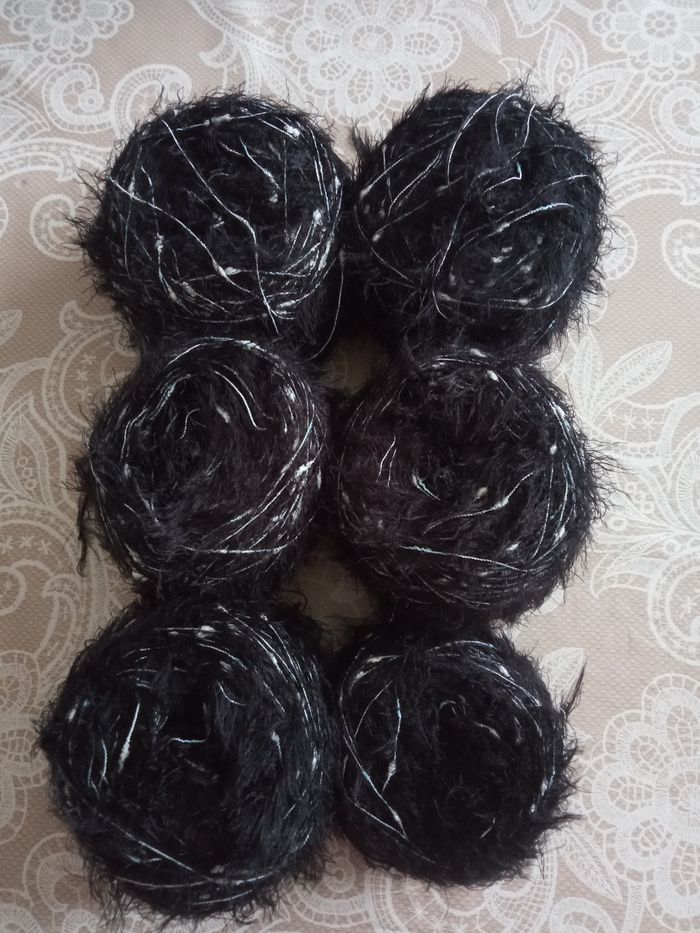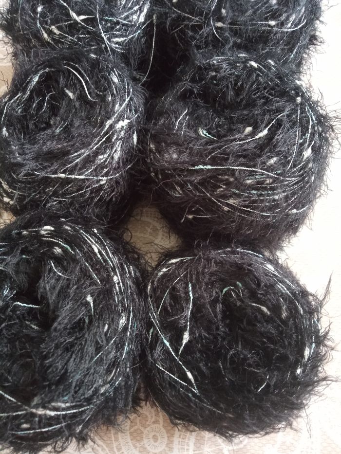 Lot de 6 Pelotes Fantaisies aspect poilu (630g) Couleur: Noir, Vert Pastel et Blanc 1 fil fantaisie poilu + 1 autre fantaisie plutôt fin au total 630g Aiguilles N°2-2,5 environ Lot en parfait état