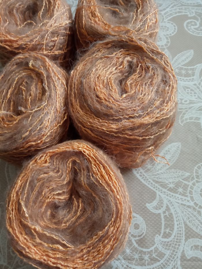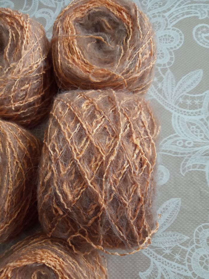 Lot de 5 Pelotes Fantaisies (380g) Couleur: Orange et Marron très Clair 2 fils fantaisies pas très épais de taille différente au total 380g Aiguilles 2,5 environ Lot en parfait état