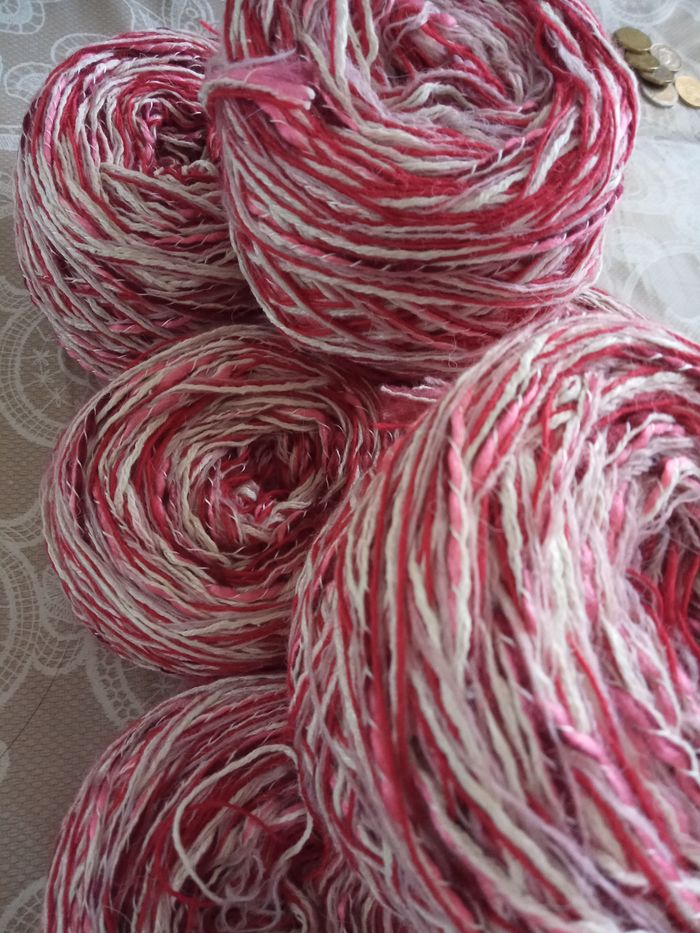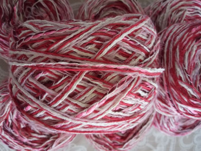 Lot de 8 Pelotes Fantaisies (810g) Couleur: Blanc, Rose et Rouge 3 fils pas très épais de taille différente au total 810g Aiguilles N°2,5-3 Lot en parfait état