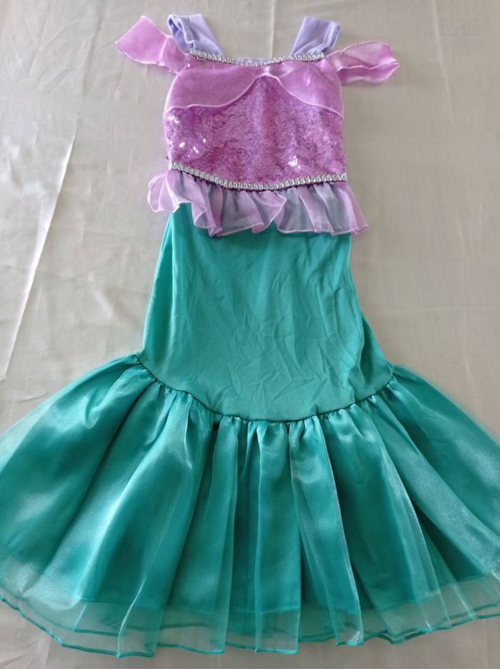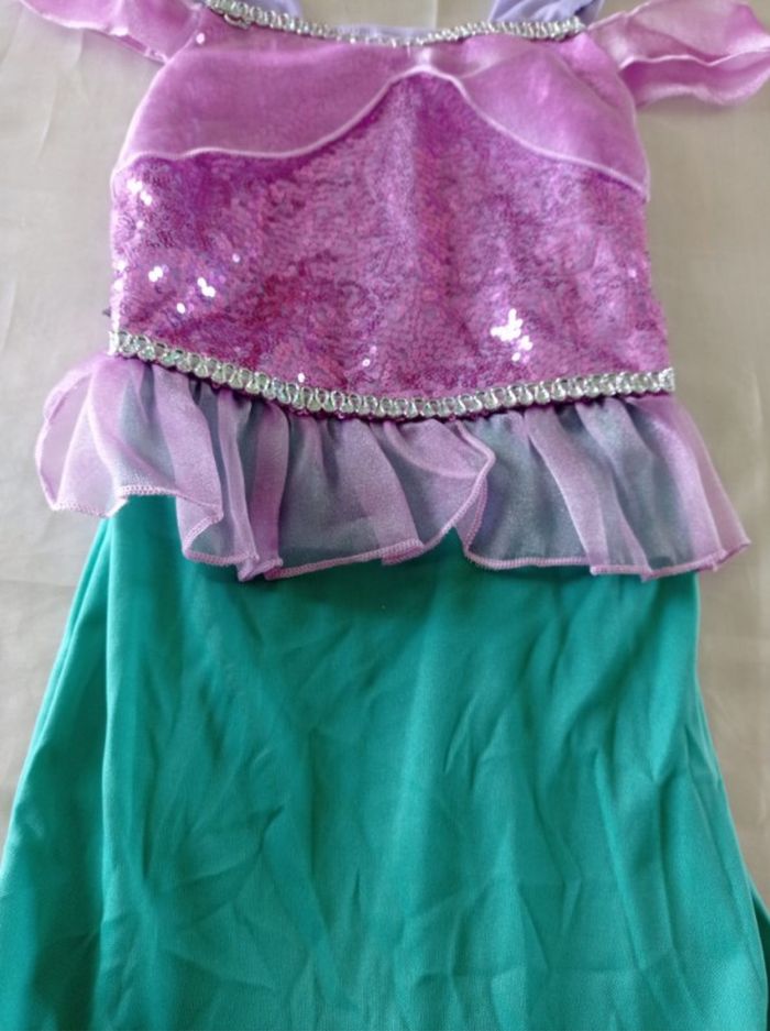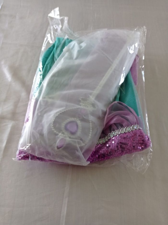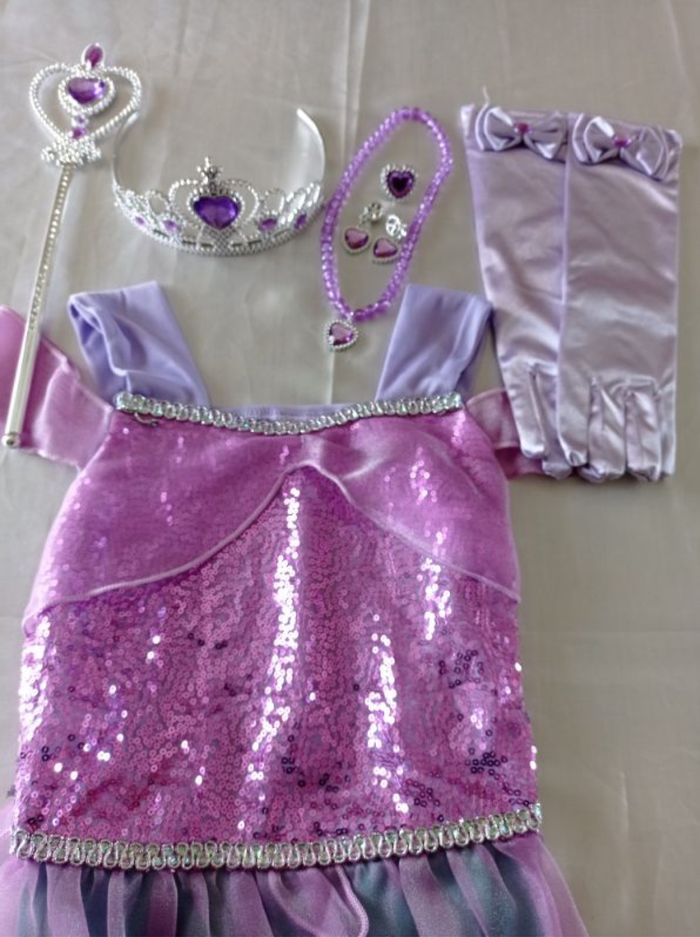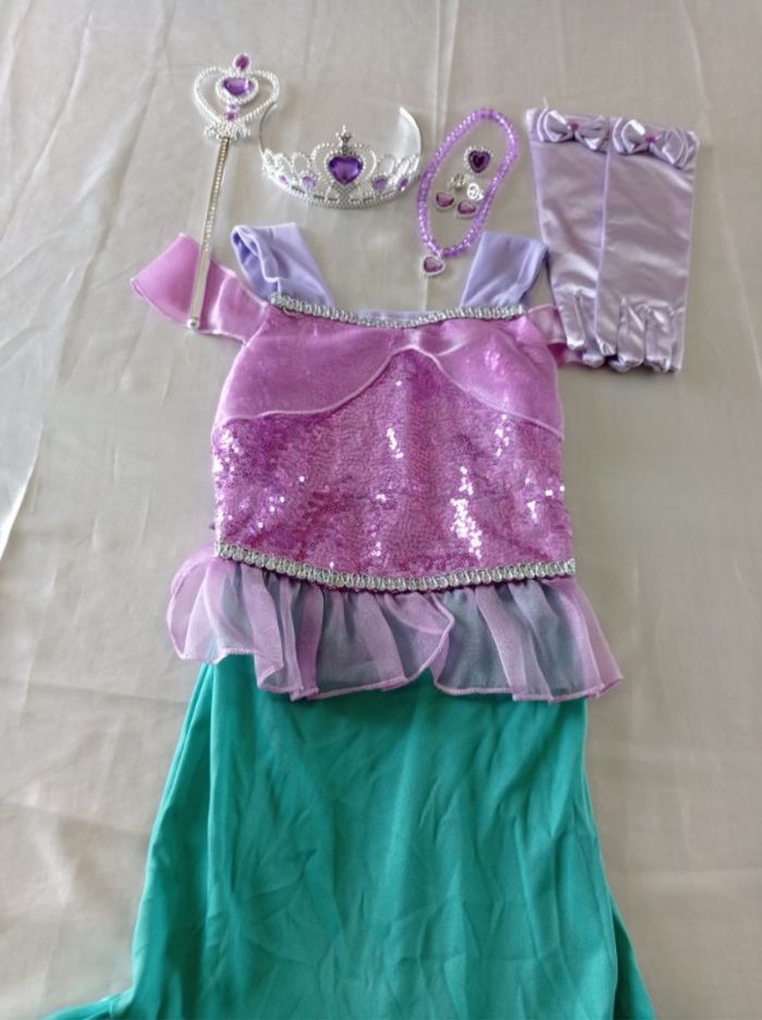 Déguisement sirène violette et ces accessoires (baguette, couronne, gants, bijoux). La taille convient aux petites filles de 5ans (longueur de la sirène 80cm). Totalement neuve, vendue dans son emballage d’origine. Envoi rapide