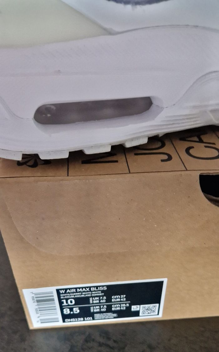 Nike Air Max Bliss pour femme blanches (coloris Blanc/Blanc/Summit White) - Collection Sportswear Il s'agit d'une pointure 42 qui convient si vous chaussez habituellement du 41. Dessus / Tige : Cuir et textile - Doublure : Textile - Semelle de propreté : Textile - Semelle d'usure : Matière synthétique - Épaisseur de la doublure : Doublure protégeant du froid - Matière : Mesh Etat neuf (seule la semelle n'est pas immaculée car ces sneakers ont été essayées) Prix d'origine : 140€