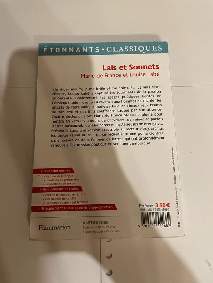 Livre Lais et Sonnet Marie de France et Louise Labé ISBN : 9782081511682 édition : flamarion étonnants classiques d'autres livres dans mon dressing, n'hésitez pas à faire des lots ! (43) #livre #bacfrancais #louiselabe #mariedefrance #lycee #laisetsonnets #litterature #litteratureclassique