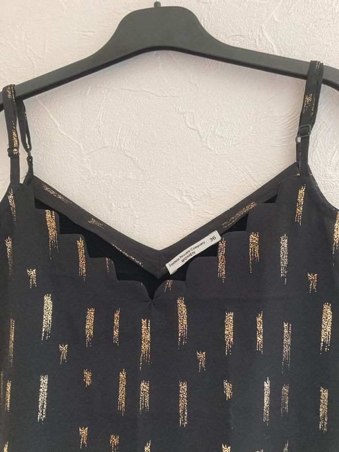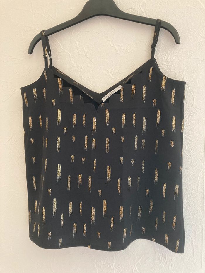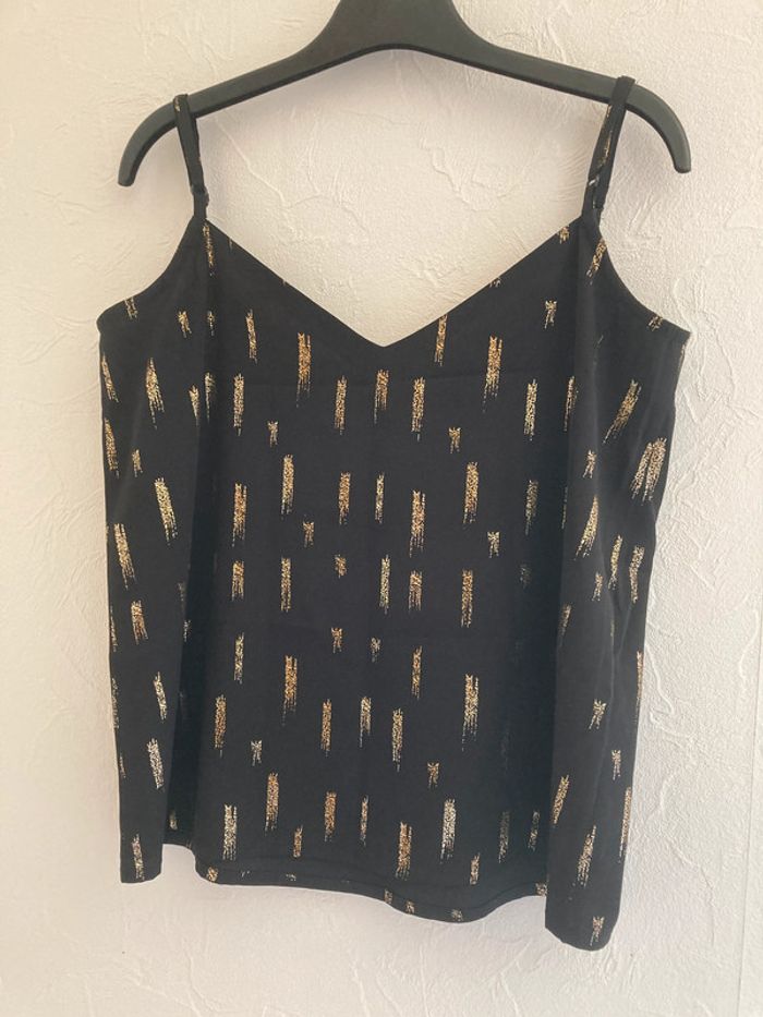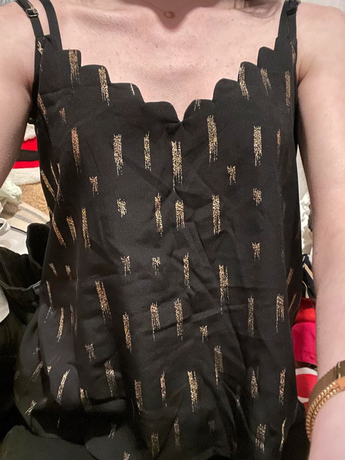 Débardeur Noir et doré Districenter Bretelles réglables Col V Taille 36 / S 100% polyester Porté 2 fois mesures : - largeur aisselles : 44 cm - largeur bas : 51 cm - longueur devant : 34 cm (57) #débardeur #débardeurfemme #top #topfemme #femme36 #été #debardeur36 #debardeurS #debardeurfemme36 #debardeurfemmeS #top36 #topS #topfemme36 #topfemmeS #femme #femmeS